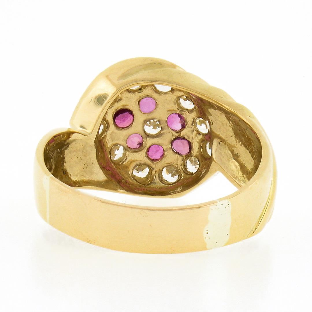 A vintage solid 18k yellow gold ring. with 6 round brilliant cut natural rubies, and 12 round brilliant cut cubic zirconias. The ring is size 7.5, weighs a total of 6.29 grams, and measures 12.90mm wide.