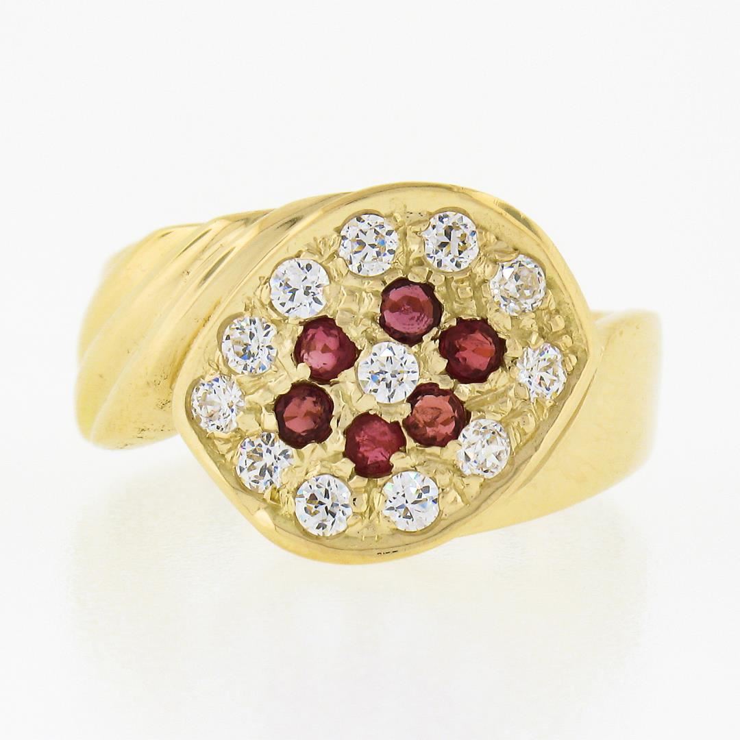 A vintage solid 18k yellow gold ring. with 6 round brilliant cut natural rubies, and 12 round brilliant cut cubic zirconias. The ring is size 7.5, weighs a total of 6.29 grams, and measures 12.90mm wide.