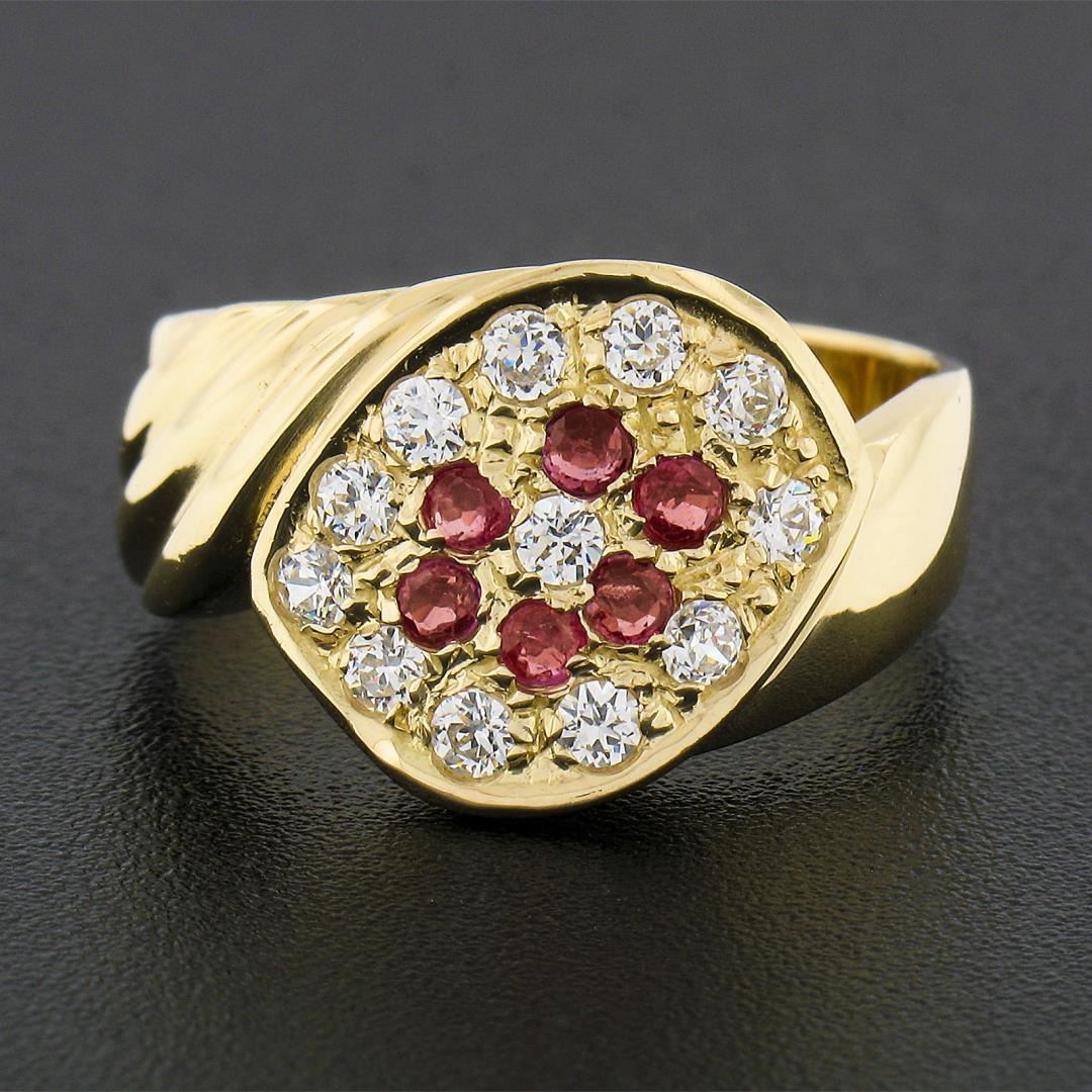 A vintage solid 18k yellow gold ring. with 6 round brilliant cut natural rubies, and 12 round brilliant cut cubic zirconias. The ring is size 7.5, weighs a total of 6.29 grams, and measures 12.90mm wide.