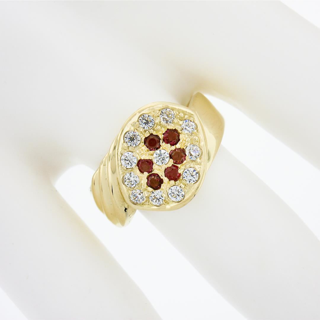 A vintage solid 18k yellow gold ring. with 6 round brilliant cut natural rubies, and 12 round brilliant cut cubic zirconias. The ring is size 7.5, weighs a total of 6.29 grams, and measures 12.90mm wide.