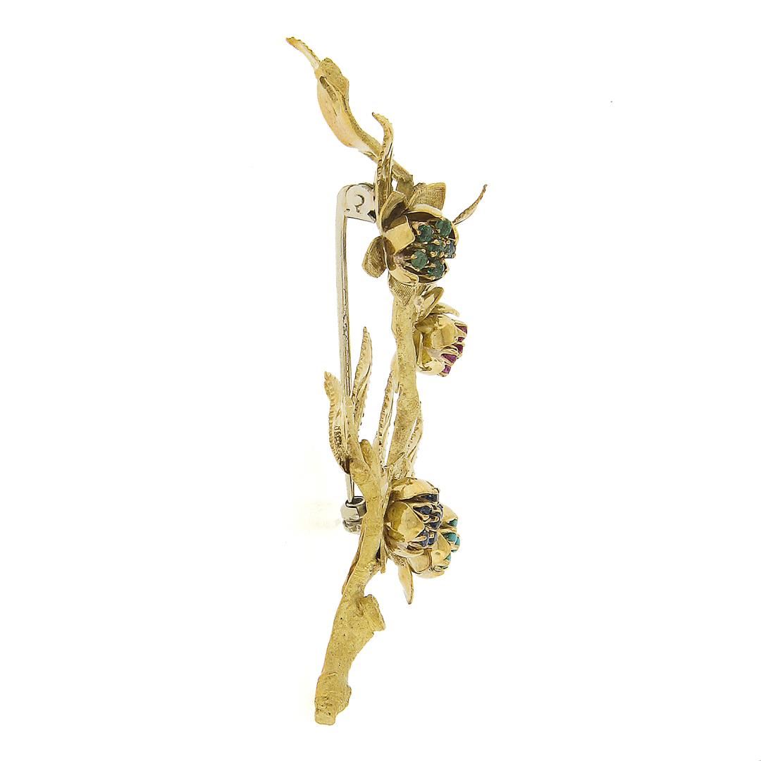Vintage 18K Gold Ruby Emerald Sapphire & Turquoise Textured Branch Pin Brooch