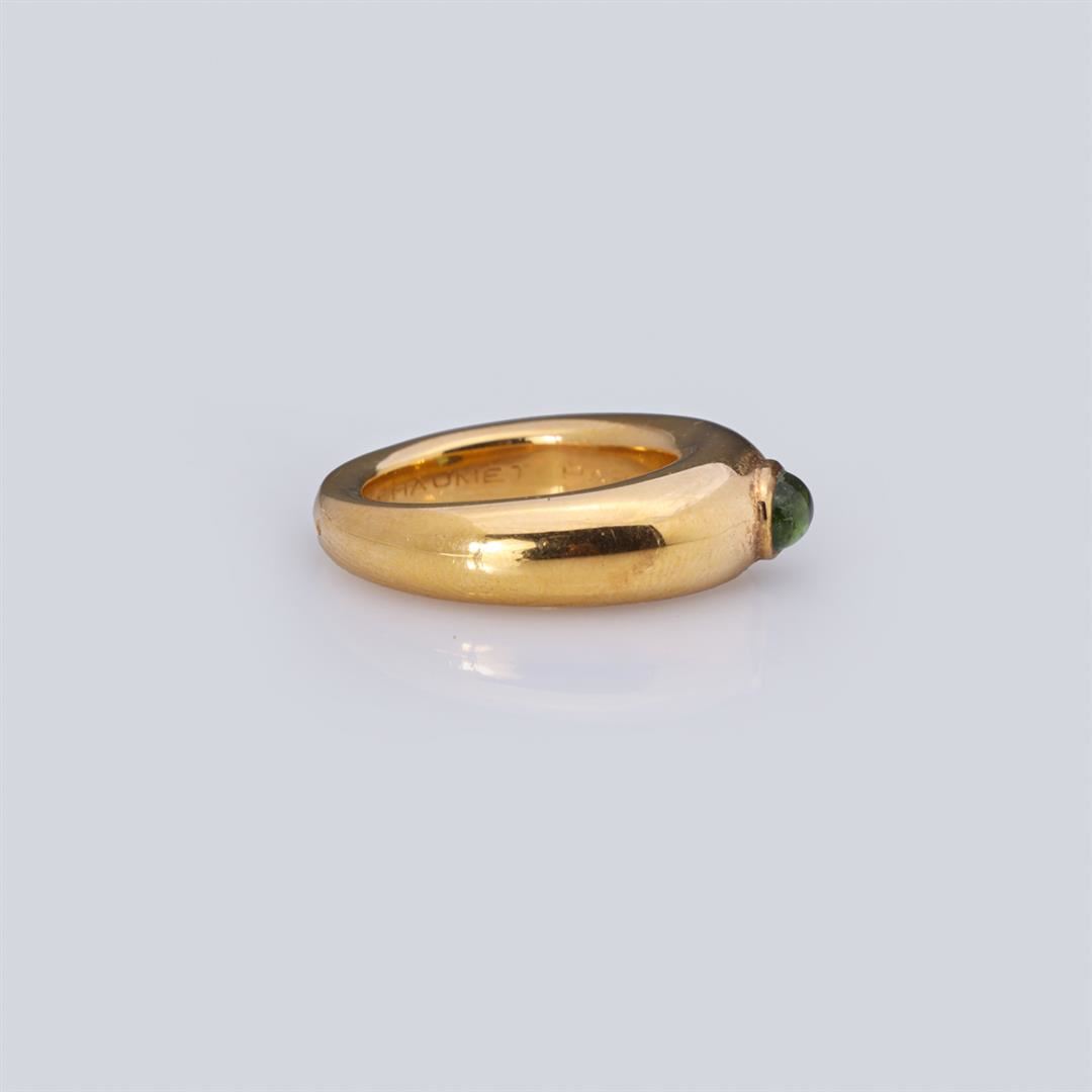 A fine vintage 18k yellow gold ring by Chaumet, Paris; set with a oval green tourmaline cabochon in oval bezel, the interior of the ring marked CHAUMET PARIS 153955-750, with two French touch marks to bottom of shank; gross weight 9.2 g, size 6