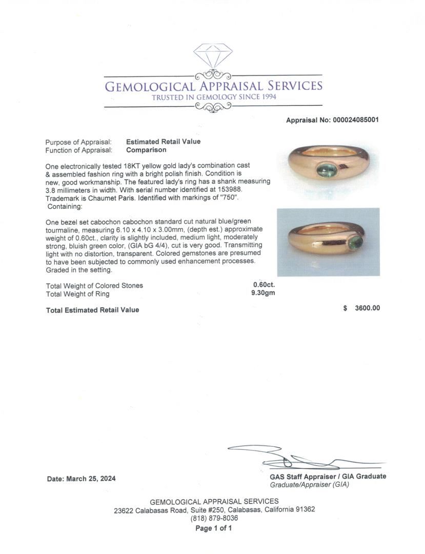 Vintage 18K Gold & Tourmaline Ring by Chaumet Containing one bezel set cabochon pink tourmaline weighing approximately 0.60 cts. Total weight is 9.3 gm. Estimated retail value $3,600.