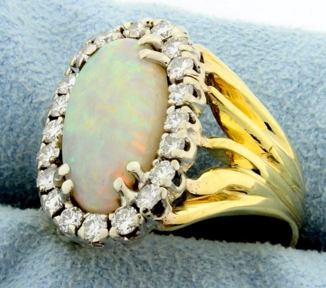 18K yellow gold. This ring has a huge 16x8.5mm oval opal with fantastic color of play, very high quality. Also has .6ct total weight of stunning SI/G diamonds. Size 6. Can be resized. 11g