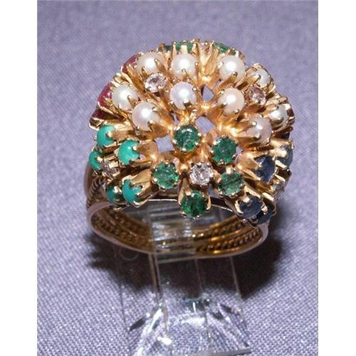 Beautiful Princess Ring in 18K yellow gold with ruby, sapphire, pearl, diamond, emerald and what I believe to be jade stones. Stones are approximately 3mm eachand there are a total of 40 stones. Size 8. 9.5 grams.