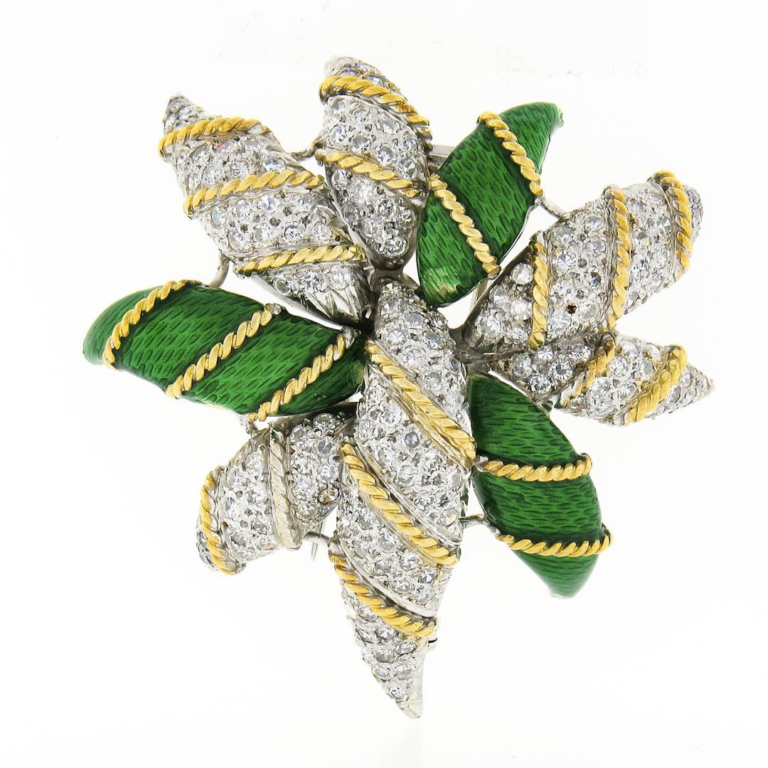 a vintage 18k white & yellow gold enamel work flower brooch. with 156 old single cut natural diamonds (G/H - VS2/SI1 ; 1.20ctw ). Measures 45.10x46.20mm and weighs a total of 21.47 grams.