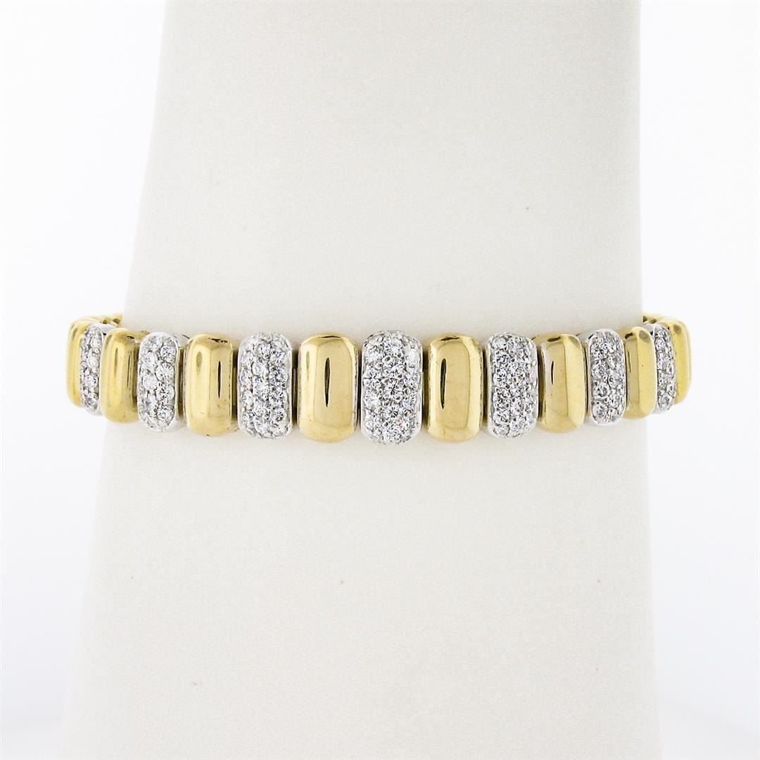 A vintage solid 18k yellow and white gold oval link bracelet, with 109 round brilliant cut natural diamonds ( F/G - VS1/VS2 ; 1.50ctw). It weighs a total of 44.05 grams, measures 10.30mm wide, and measures 6.25 inches in length.