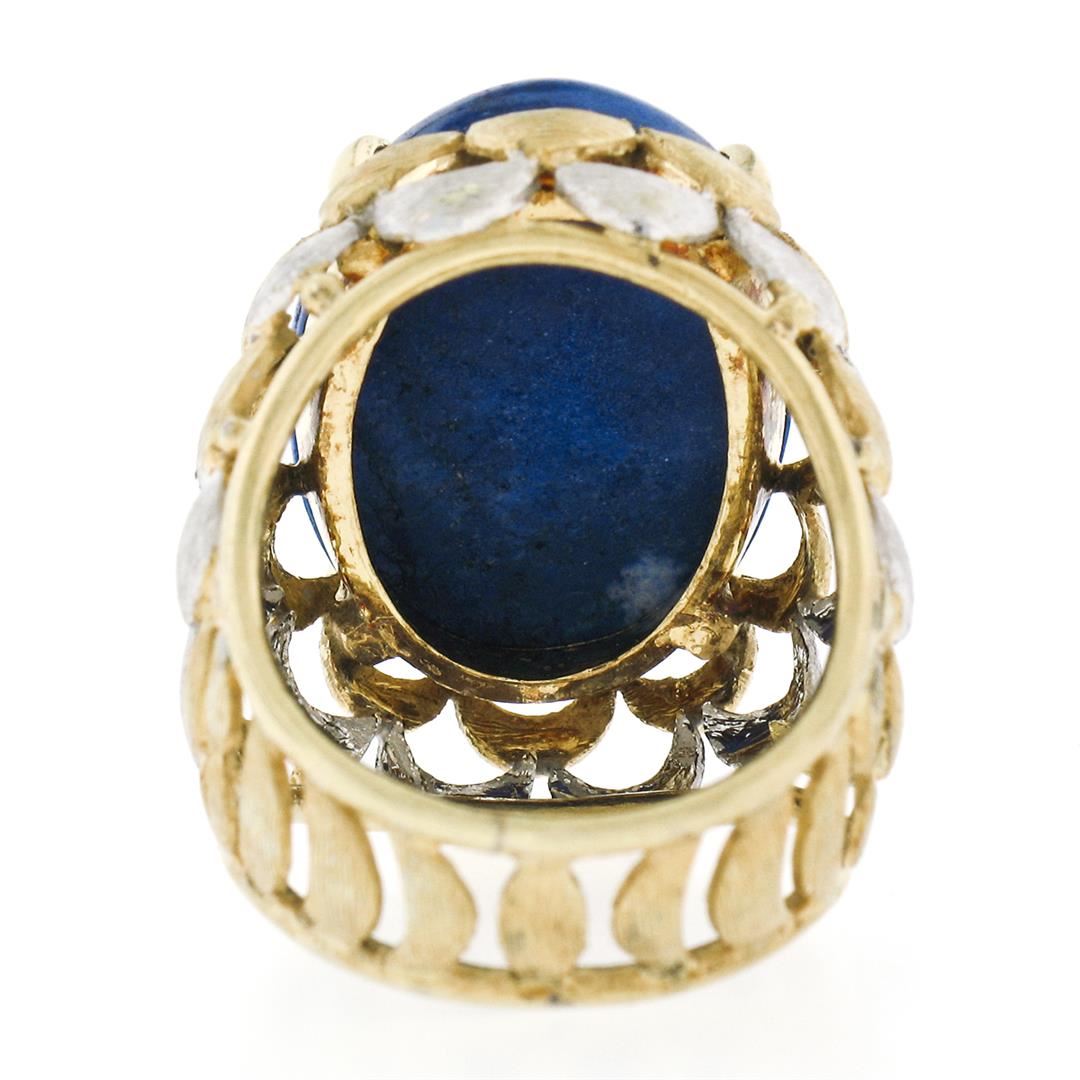 A vintage solid white and yellow gold cocktail ring, with 1 oval cabochon cut natural lapis lazuli (22.0x15.70mm). The ring is size 6.5, weighs a total of 12.79 grams, and measures 25.0mm wide.