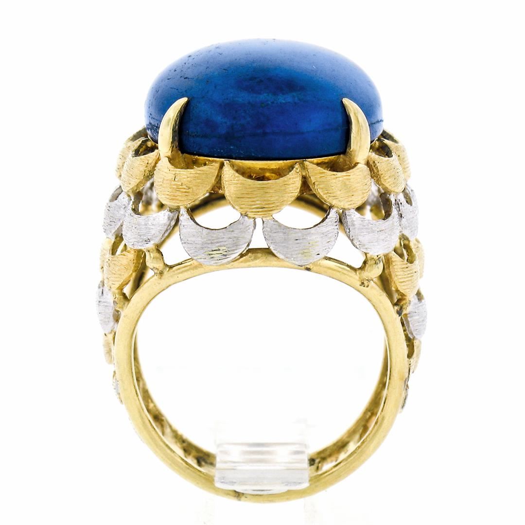 A vintage solid white and yellow gold cocktail ring, with 1 oval cabochon cut natural lapis lazuli (22.0x15.70mm). The ring is size 6.5, weighs a total of 12.79 grams, and measures 25.0mm wide.