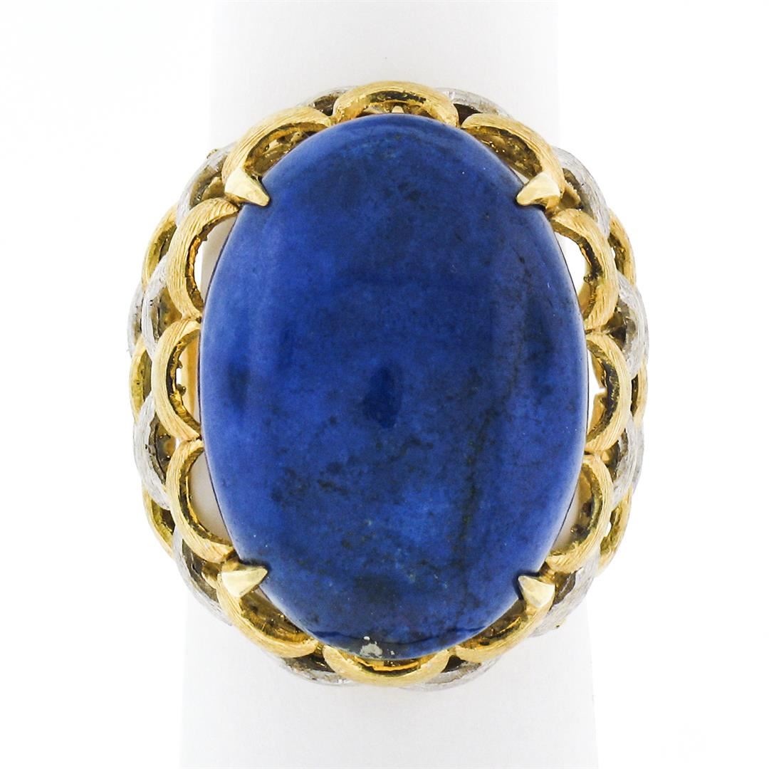 A vintage solid white and yellow gold cocktail ring, with 1 oval cabochon cut natural lapis lazuli (22.0x15.70mm). The ring is size 6.5, weighs a total of 12.79 grams, and measures 25.0mm wide.