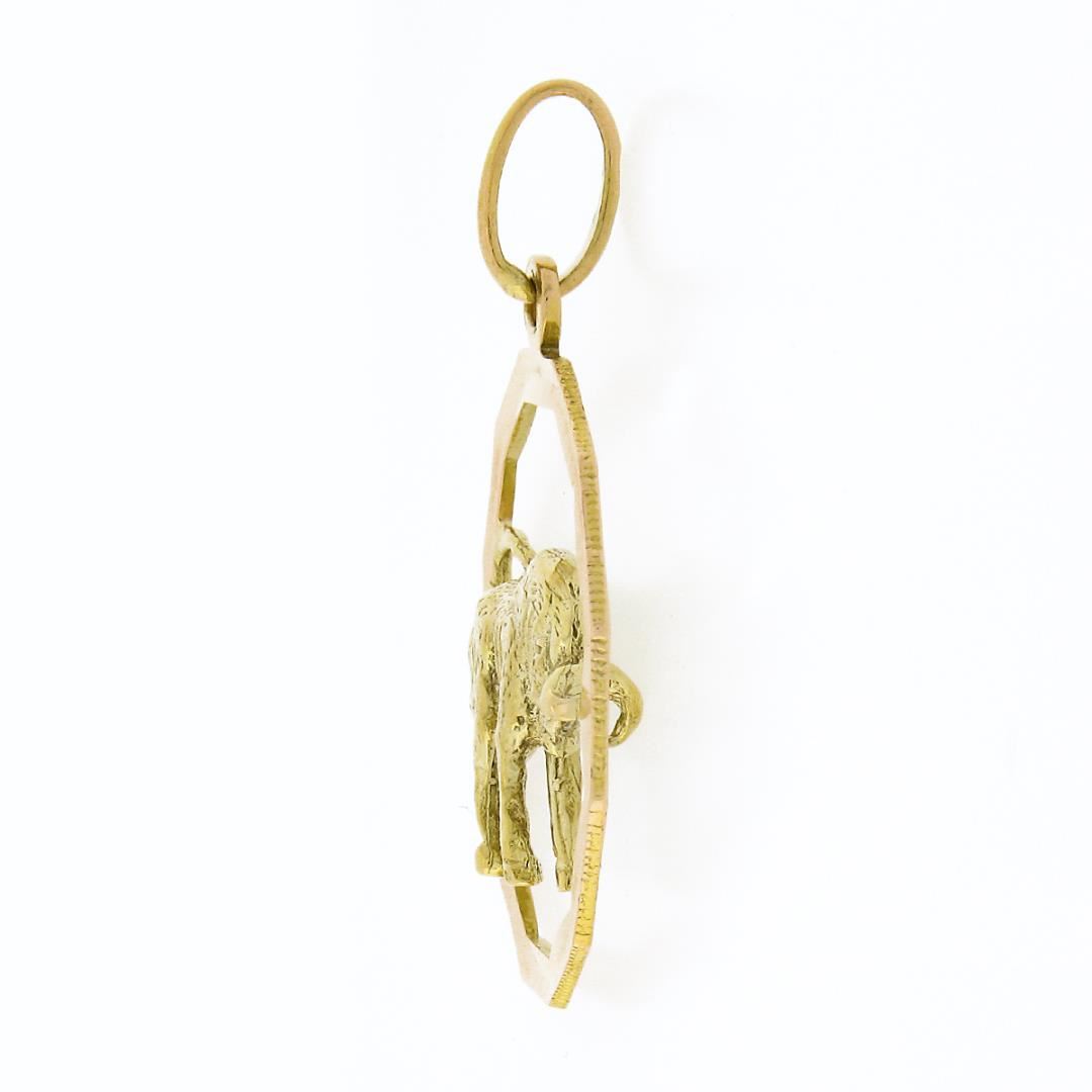 A vintage solid 18k yellow & white gold taurus charm pendant. The pendant weighs a total of 6.02 grams, measures 38.30x27.20mm including the bail, and the inside of the bail measures 4.20x7.70mm.