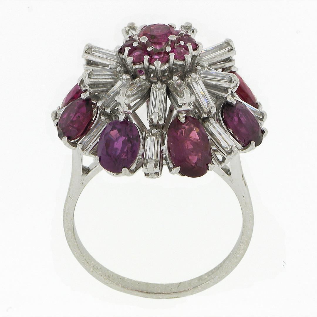 A vintage solid 18k white gold tiered cocktail ring, featuring 8 oval & 9 round cut natural rubies (5ctw), with 24 straight baguette cut natural diamonds (F/G - VS1/VS2 ; 2.0ctw). The ring is size 7.0, weighs a total of 9.25 grams, and measures 22.3mm wide.