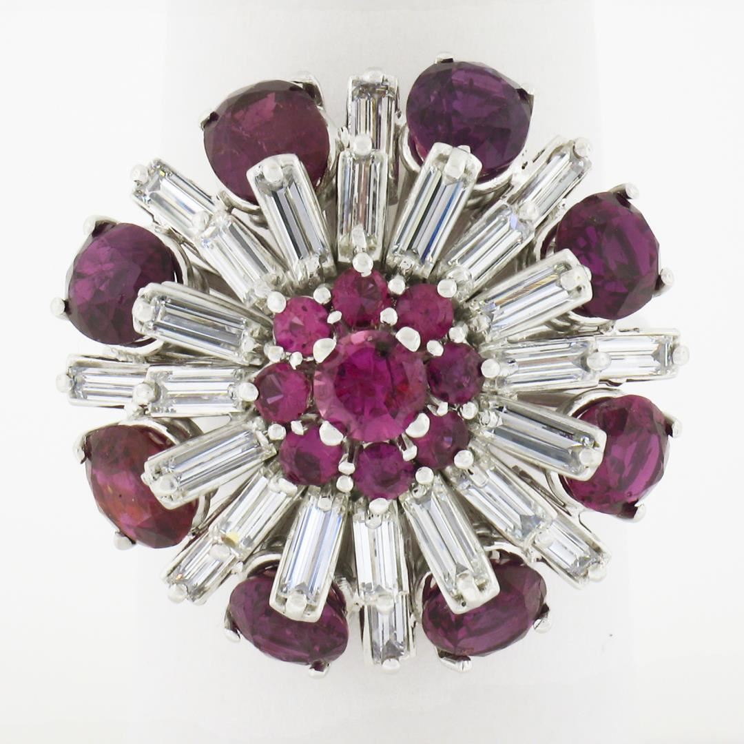 Vintage 18K White Gold 7 ctw Ruby & Baguette Diamond Tiered Cluster Cocktail Rin