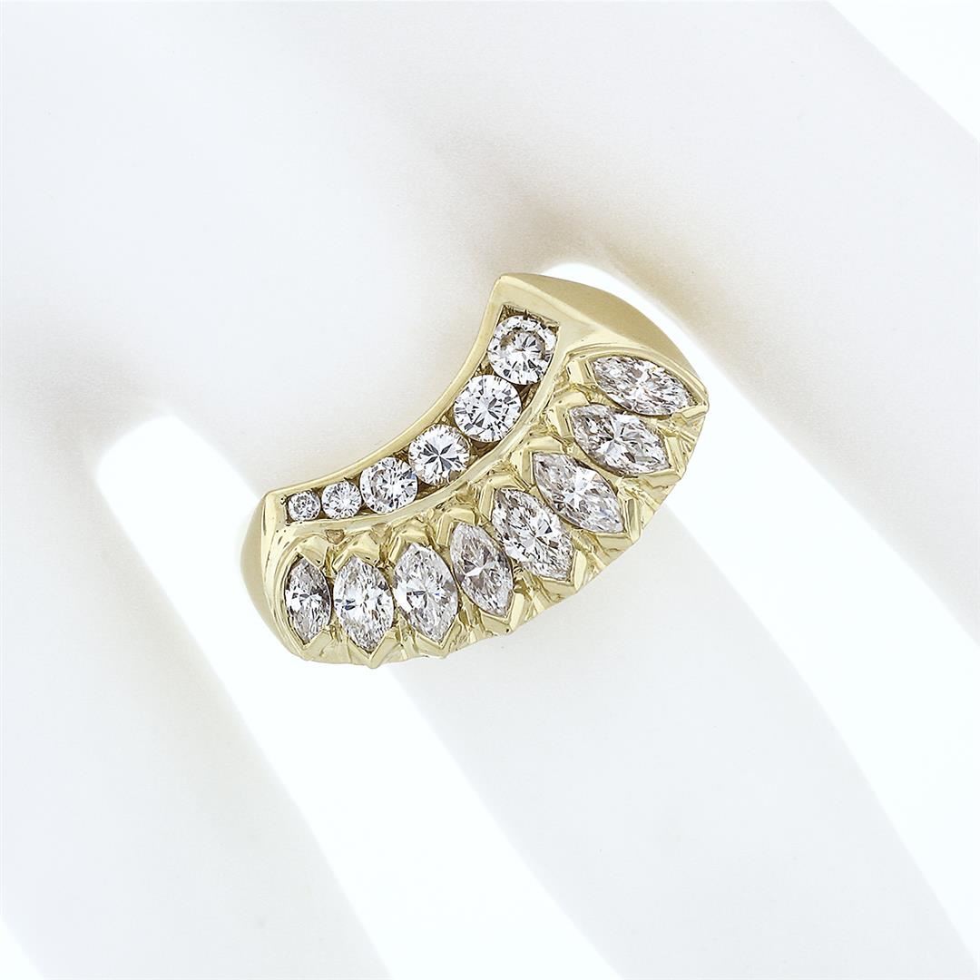 A vintage solid 18k yellow gold ring, with 8 marquise cut natural diamonds (H/I- VS1/VS2; 1.10ctw), & 6 round brilliant cut natural diamonds (G/H- VS1/VS2; 0.30ctw). The ring is size 5.5, weighs a total of 7.50 grams, and measures 10mm wide.