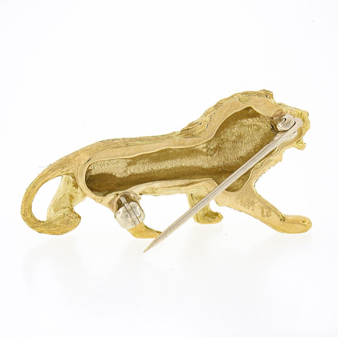 A vintage solid 18k yellow gold lion brooch, with 1 round brilliant cut natural ruby (0.02ct). Measures 16.20x33.1mm and weighs a total of 10.61 grams.