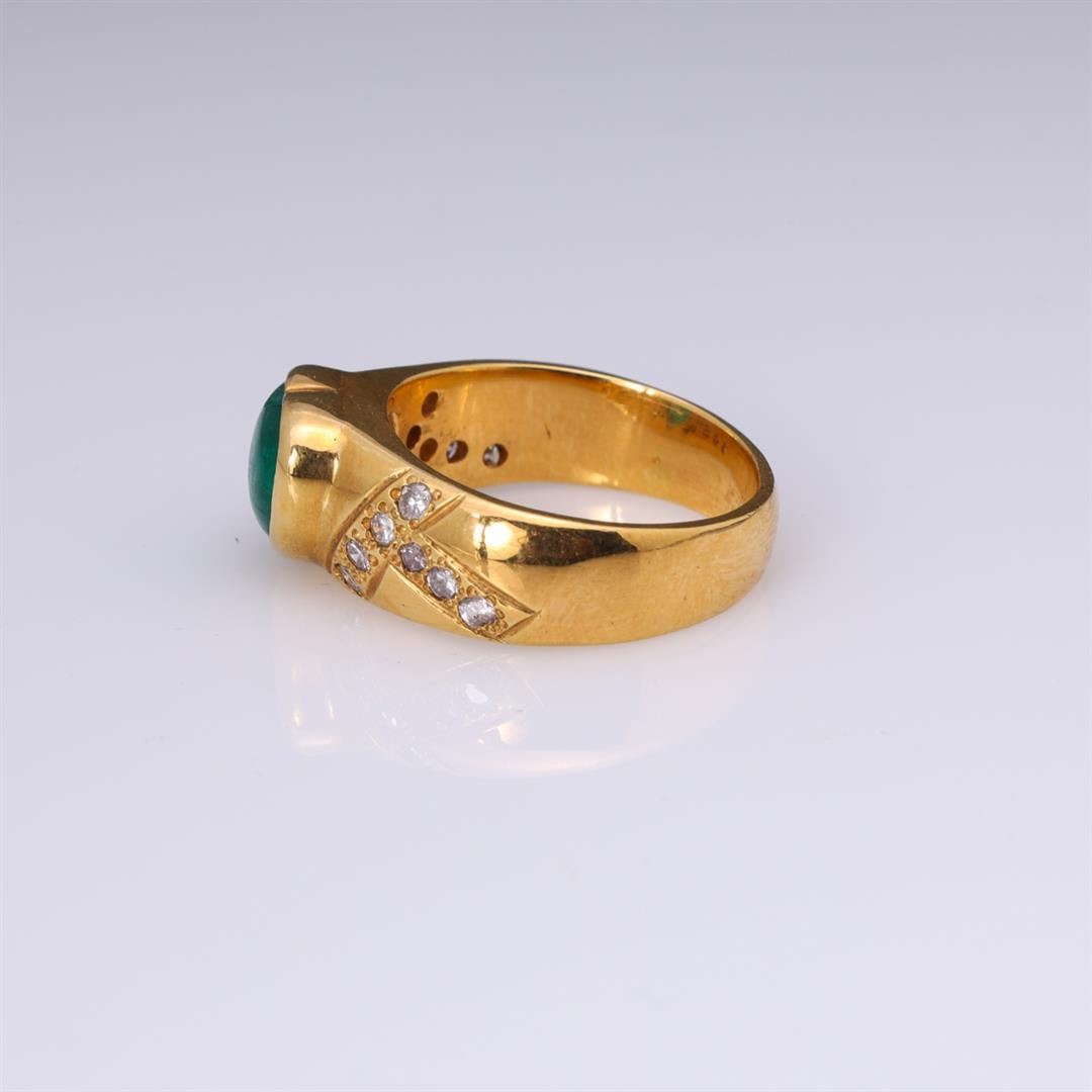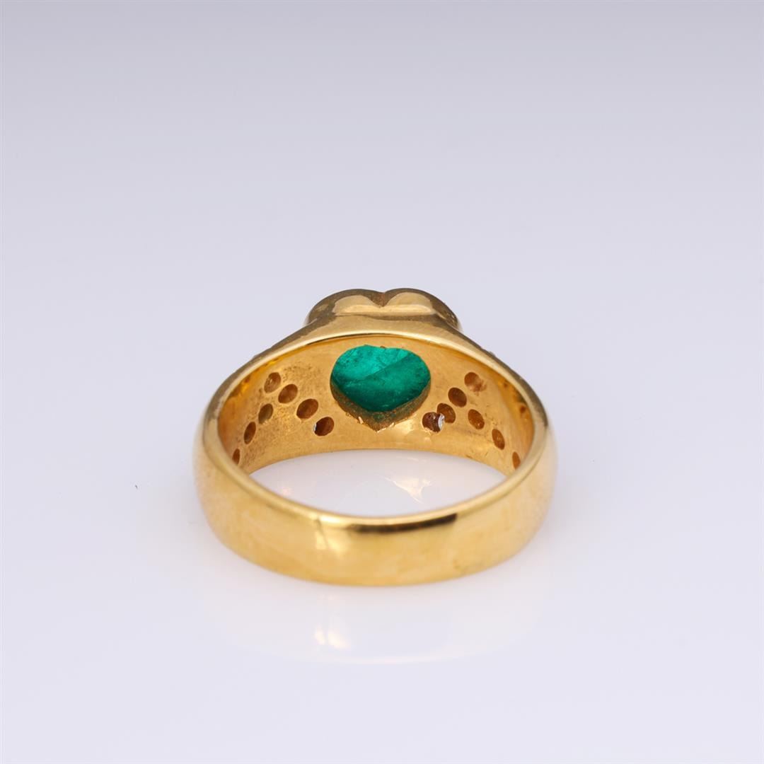 Vintage 18k yellow gold ring; the center bezel set heart shaped emerald of good color, each shoulder with intersecting rows of diamonds; gross weight 11.7 g, size 8 1/2