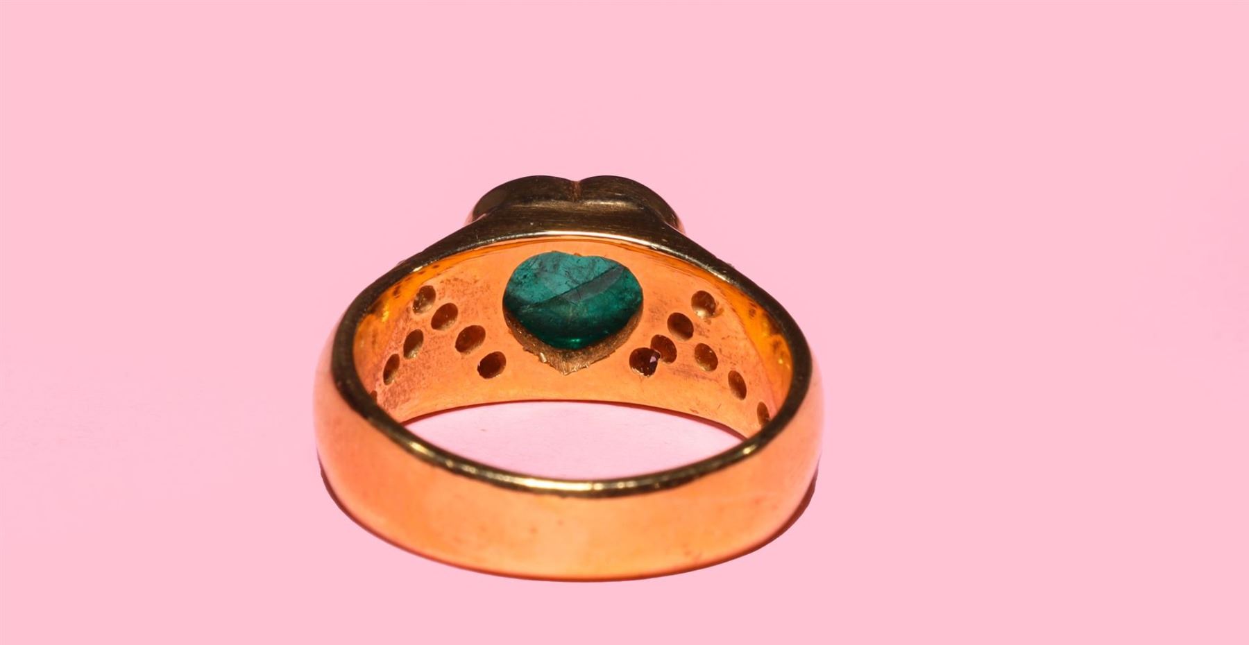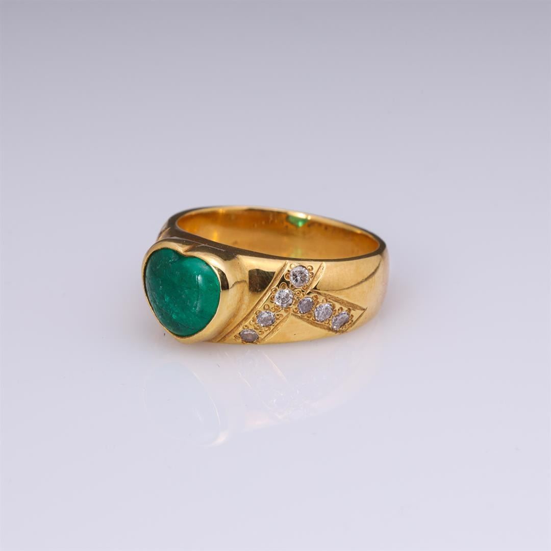 Vintage 18k yellow gold ring; the center bezel set heart shaped emerald of good color, each shoulder with intersecting rows of diamonds; gross weight 11.7 g, size 8 1/2