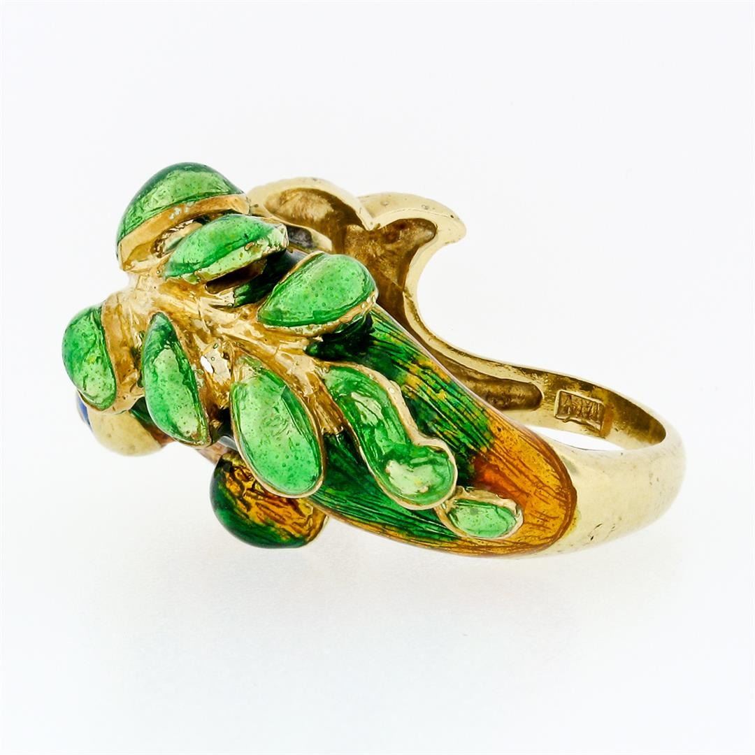 A vintage solid 18k gold dragon or fish band ring, with multi color enamel work. The ring is size 7, weighs a total of 15.16 grams, and measures 15.7mm wide.