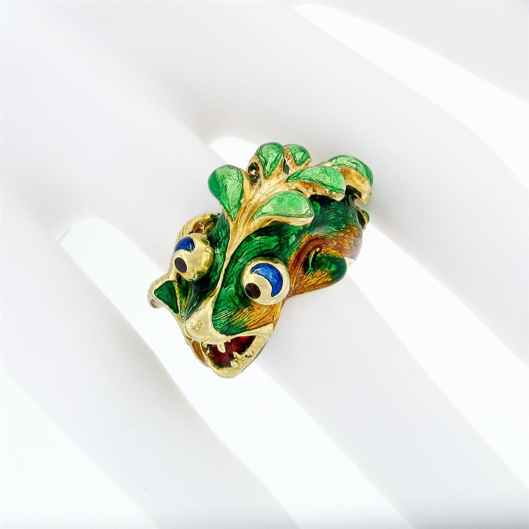 A vintage solid 18k gold dragon or fish band ring, with multi color enamel work. The ring is size 7, weighs a total of 15.16 grams, and measures 15.7mm wide.