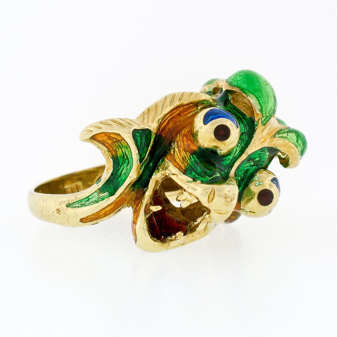 A vintage solid 18k gold dragon or fish band ring, with multi color enamel work. The ring is size 7, weighs a total of 15.16 grams, and measures 15.7mm wide.