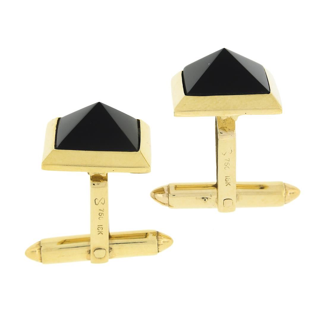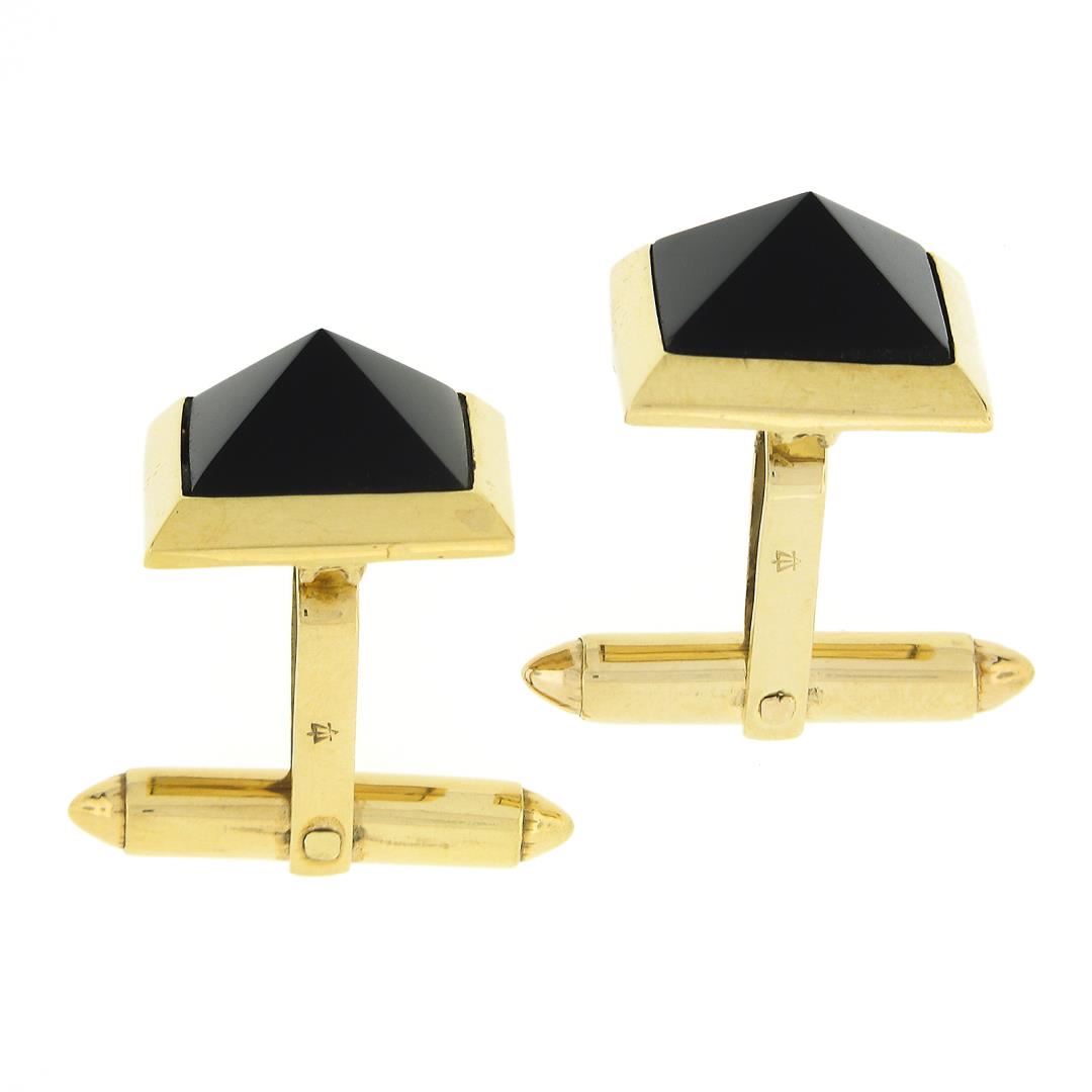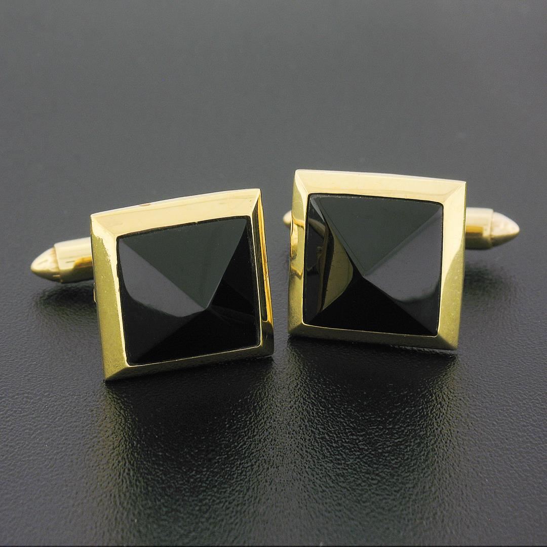 A vintage solid 18k yellow gold cufflinks, with 2 pyrmaid cut natural black onyx (11.5x11.5mm each). These cuff links have a swivel design with a clearance of 11.2mm, weigh a total of 12.28 grams, and the front panels measure 15x15mm.