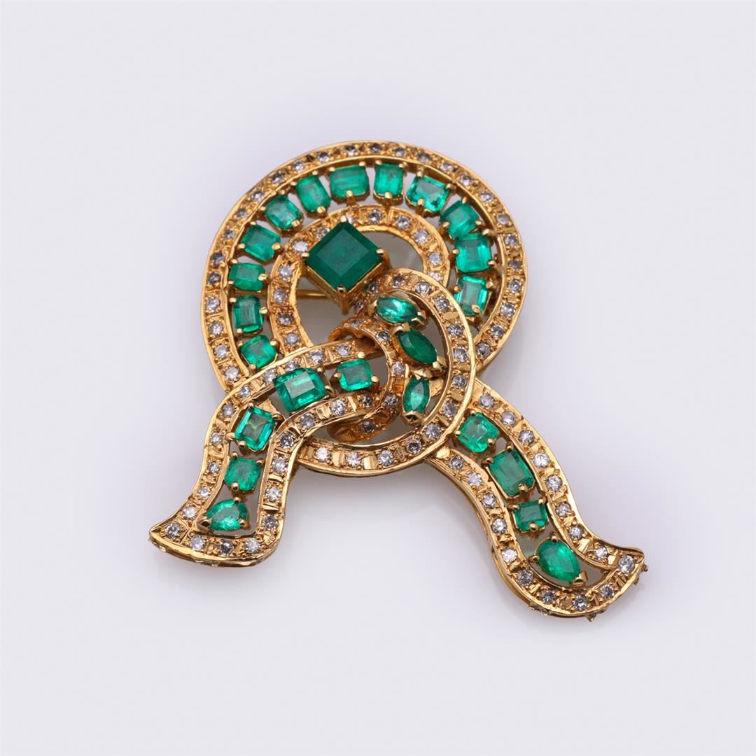 Vintage 18K Yellow Gold Ribbon Brooch with Emeralds & Diamonds containing emeralds weighing approximately 2.40cts. Ninety-six round brilliant diamonds weighing approximately 1.2 cts. Total weight is 18.2 gm. Estimated retail value $11,050.