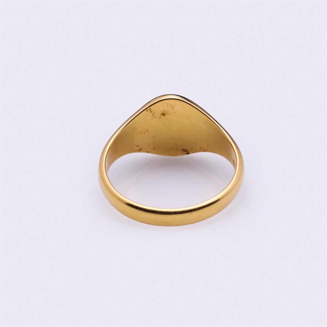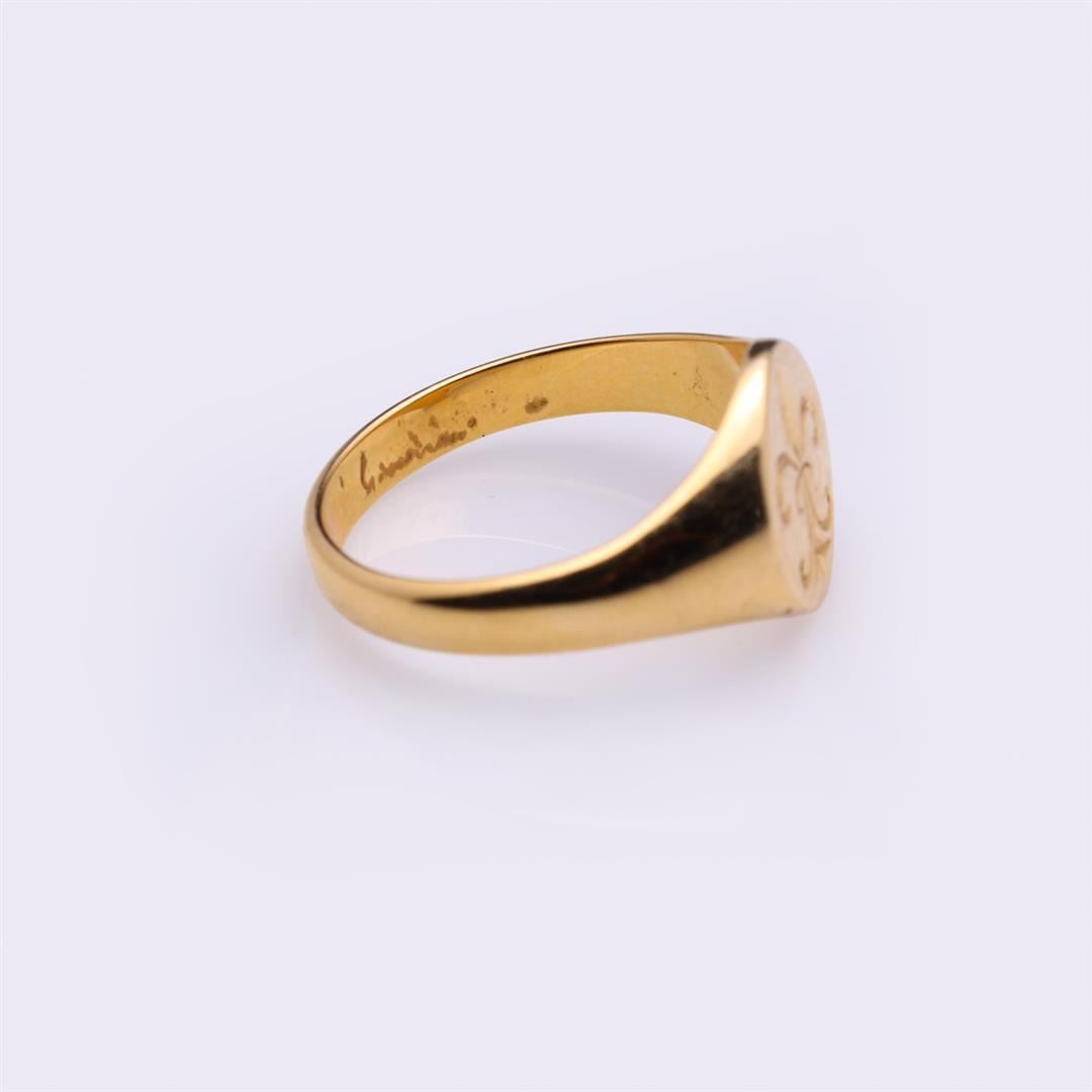 Vintage 18k yellow gold ring with engraved fleur de lis, marked 750 to interior; 8.3 g, size 10 3/4.