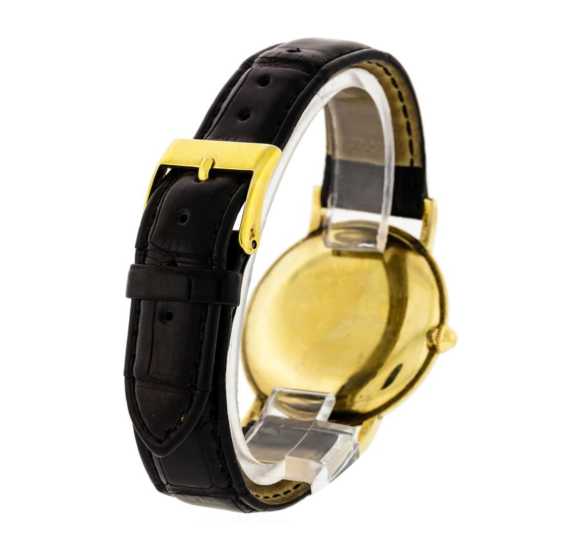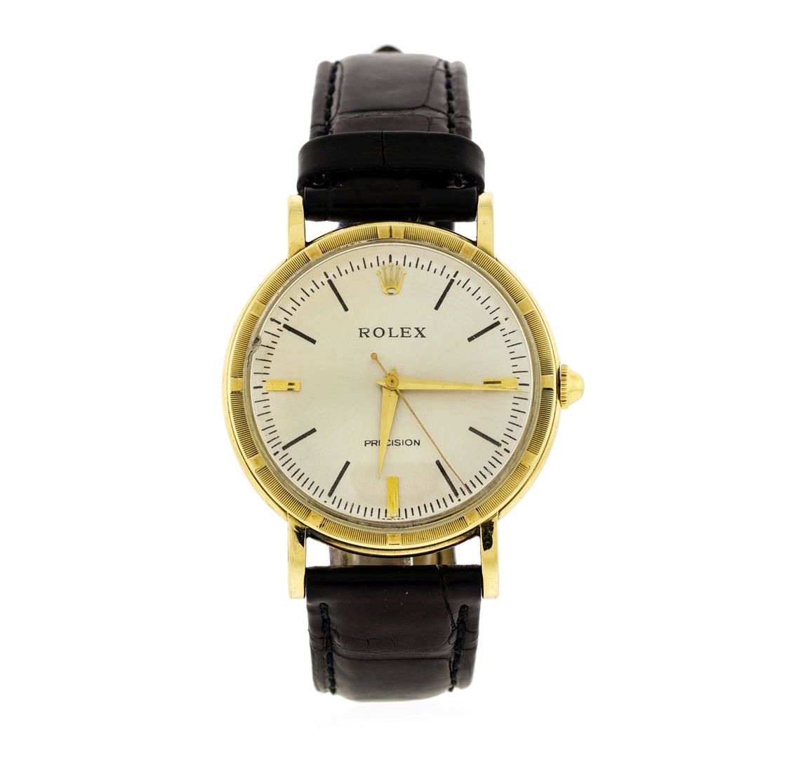 One Vintage 18K Yellow Gold Rolex Precision Metropolitan Wristwatch with custom alligator leather band. Case: 35mm 18K Yellow Gold Snap Back Case, Movement: Manual Winding, Bezel: Textured Bezel, Crystal: Acrylic Crystal, Dial: Silver with Black and Gold Markers. The watch is in good working condion.
