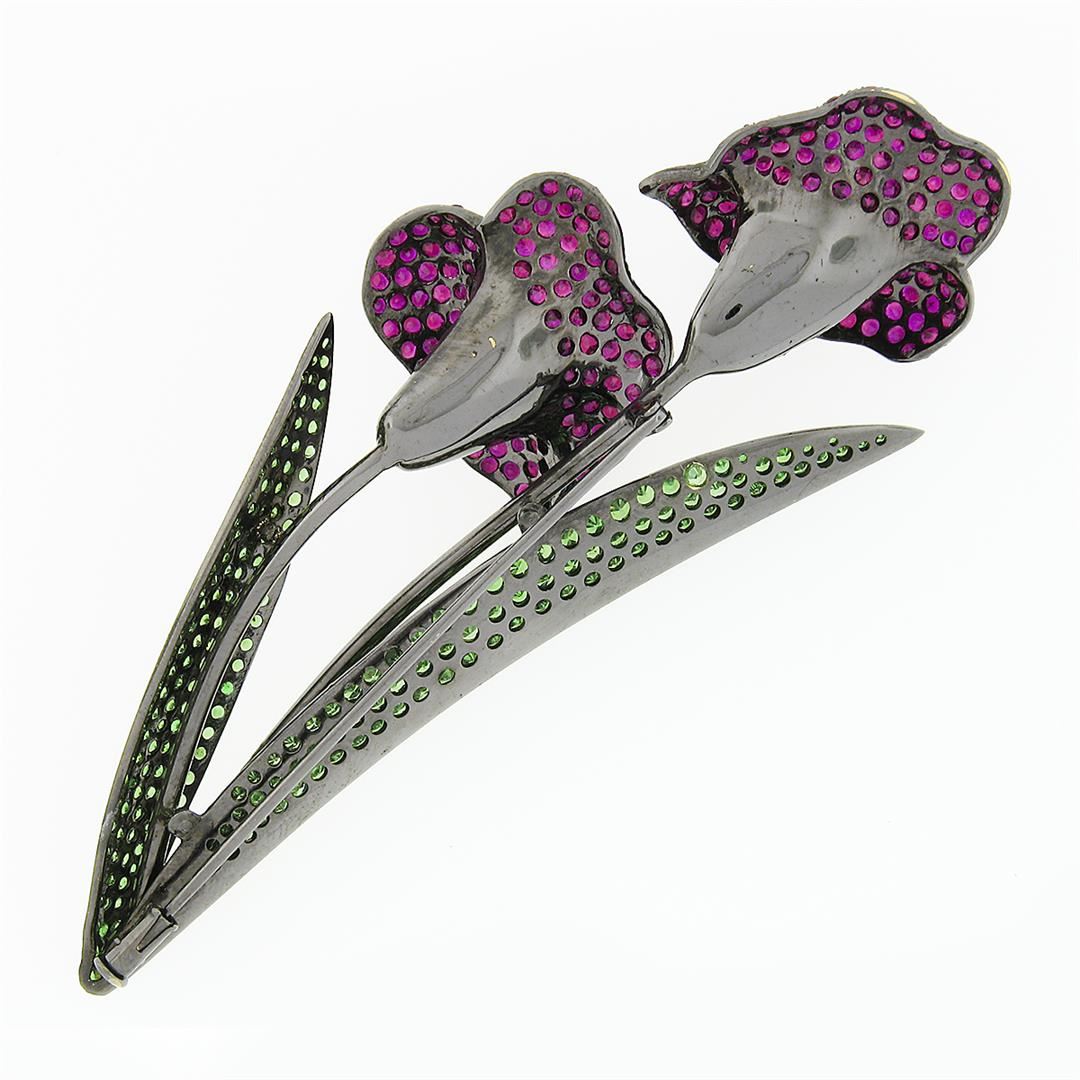 A vintage solid 18k black gold calla lily pib brooch, covered with 288 round cut natural tsavorite garnets (8.64ctw), and 291 round cut natural rubies (8.73ctw), & 62 round brilliant cut natural diamonds (G/H - SI2/I1 ; 0.93ctw). Measures 92.61x40.78mm and weighs a total of 34.11 grams.
