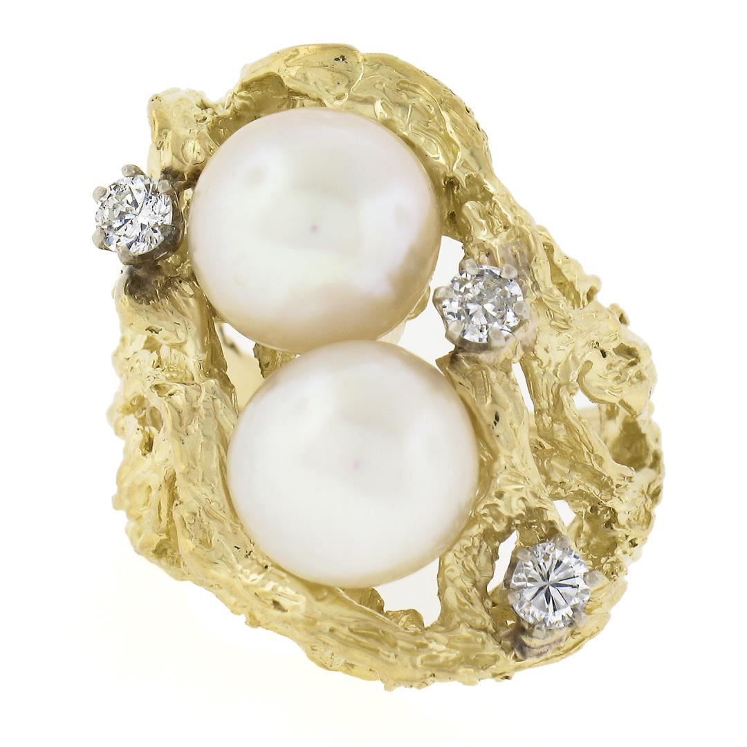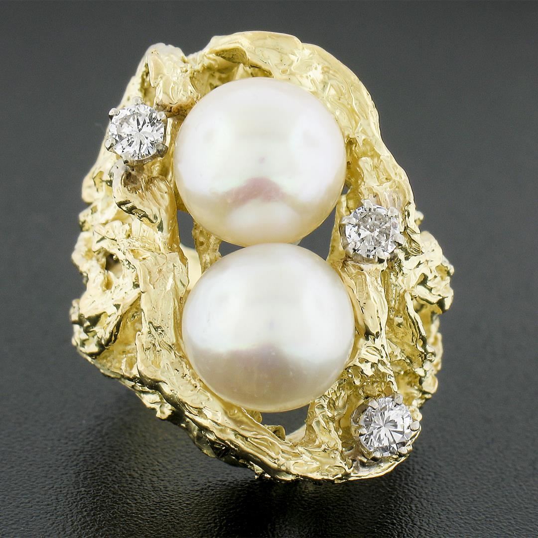 A vintage solid 18k yellow gold ring, with 2 round shape cultured pearls (9.4mm each), and 3 round cut natural diamonds (F/G - VS1-SI1 ; 0.40ctw ). The ring is size 6.0, weighs a total of 22.22 grams, and measures 25.6mm wide.