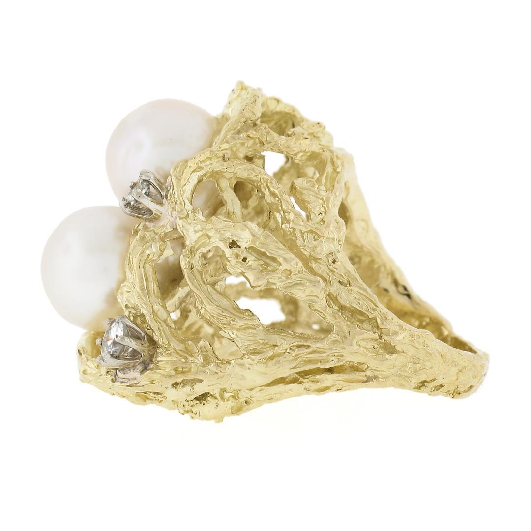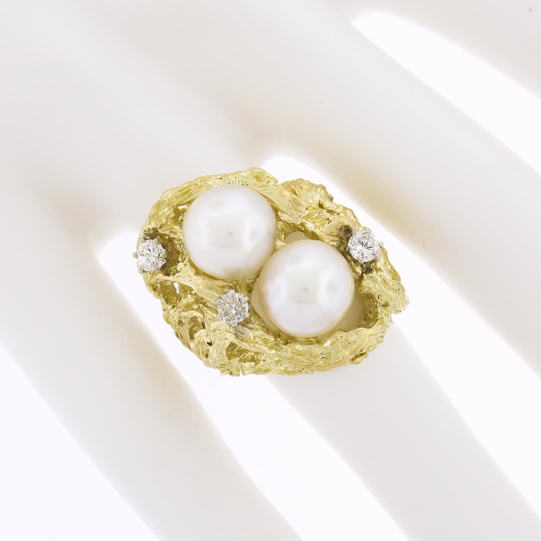 A vintage solid 18k yellow gold ring, with 2 round shape cultured pearls (9.4mm each), and 3 round cut natural diamonds (F/G - VS1-SI1 ; 0.40ctw ). The ring is size 6.0, weighs a total of 22.22 grams, and measures 25.6mm wide.