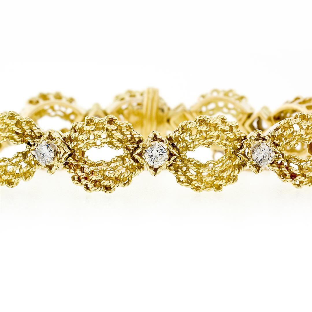 A vintage solid 18k yellow gold puffed link bracelet, with 11 round brillaint cut natral diamonds (F/G - VS1/VS2; 1.51ctw). It weighs a total of 34.50 grams, measures 12.2mm wide, and measures 6.5 inches in length.