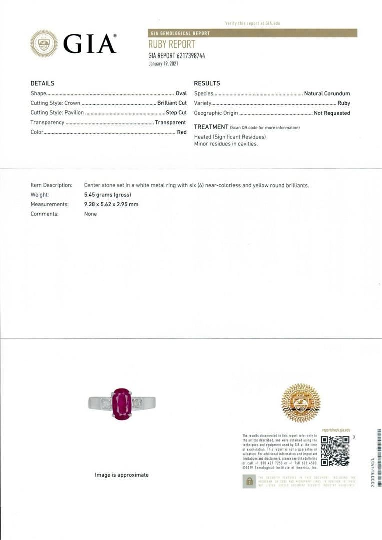 A vintage solid 18k white gold engagement ring, with 1 Gia certified oval cut natural ruby (1.38ct), Accented with 6 old transitional cut natural diamonds (H/I - SI1/SI2 ; 0.24ctw). The ring is size 7.5, weighs a total of 5.45 grams, and measures 9.3mm wide. Comes with all original relevant certifications.