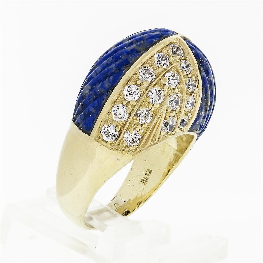A vintage solid 18k yellow gold cocktail ring, with 2 carved grooved natural lapis, & 32 round brilliant cut natural diamonds (D/E- VVS2/VS1; 1.92ctw). The ring is size 10.5, weighs a total of 18.59 grams, and measures 17.1mm wide.