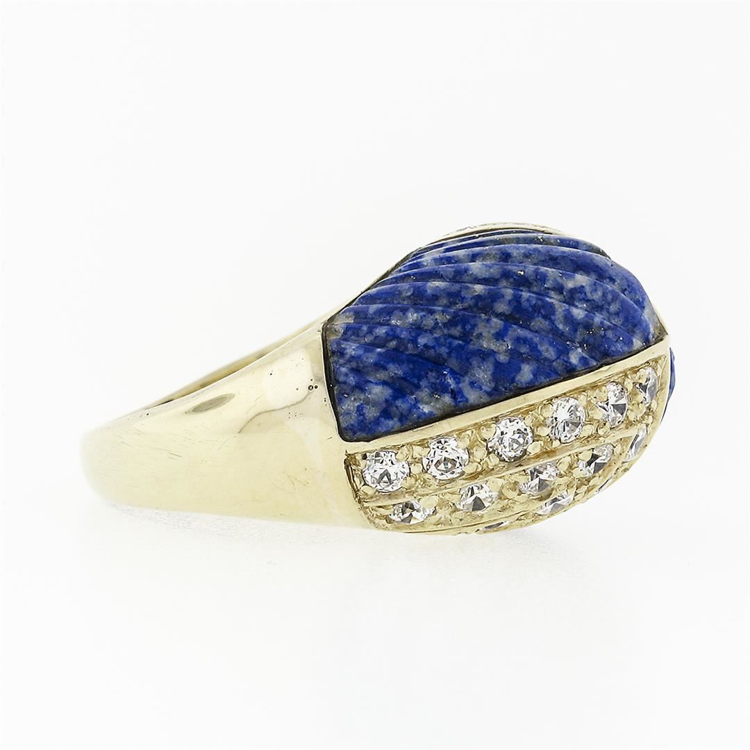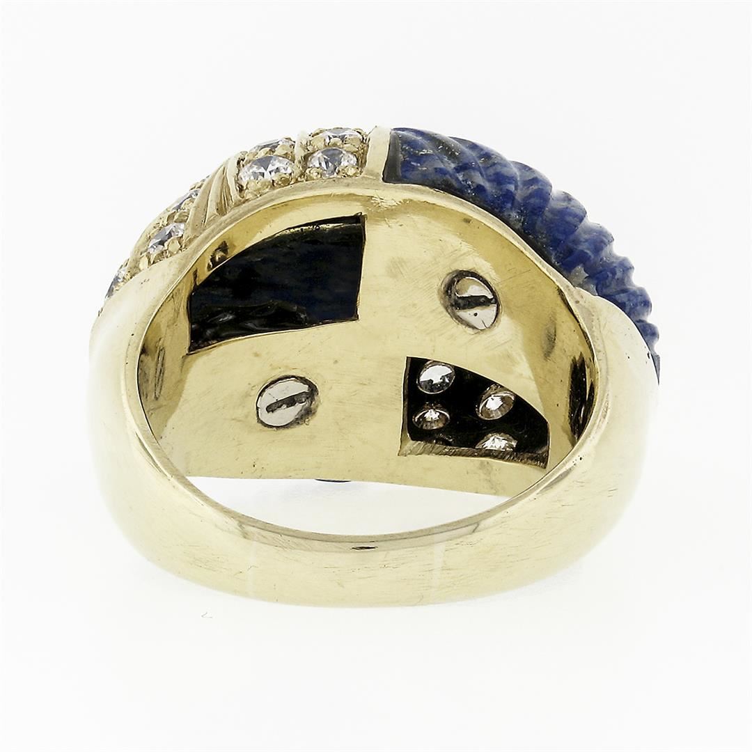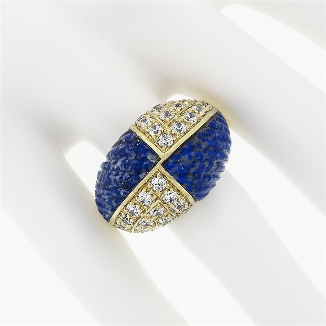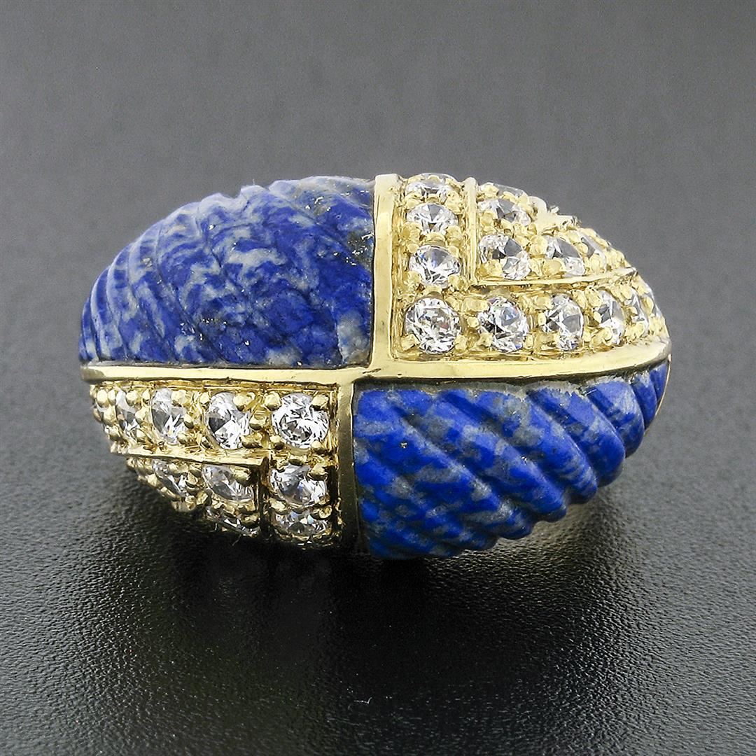 A vintage solid 18k yellow gold cocktail ring, with 2 carved grooved natural lapis, & 32 round brilliant cut natural diamonds (D/E- VVS2/VS1; 1.92ctw). The ring is size 10.5, weighs a total of 18.59 grams, and measures 17.1mm wide.