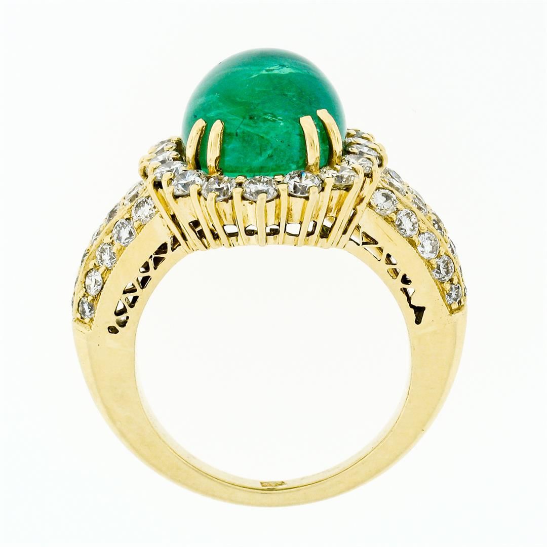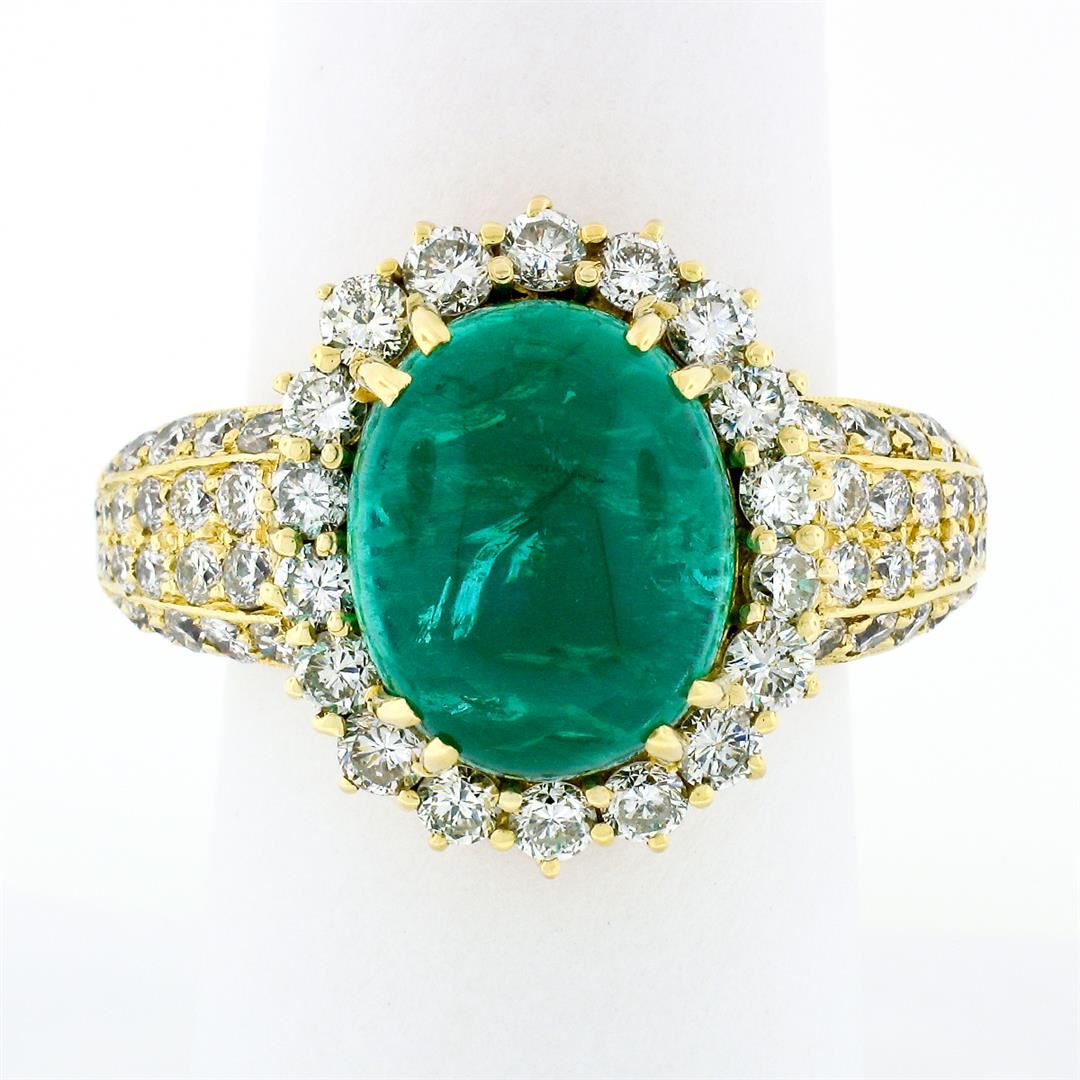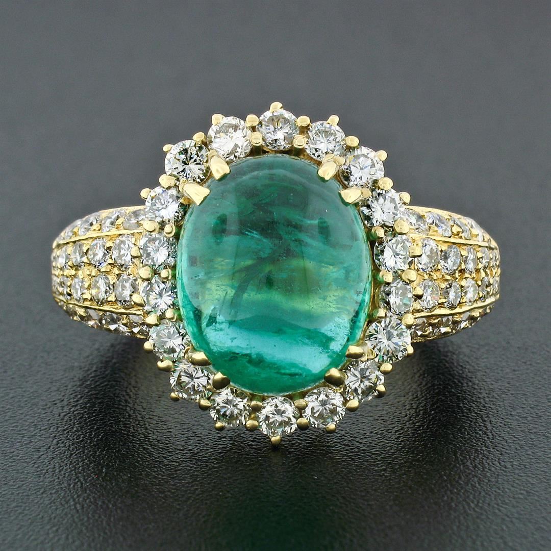 A vintage solid 18k yellow gold ring with 1 AGL certified oval cabochon cut natural emerald (13.34 x 10.82mm; 8.58ct) and 62 round brilliant cut natural diamonds (G/H - VS1/VS2; 2.50ctw). The ring is size 8.0, weighs a total of 14.43 grams, and measures 19.11mm wide. Comes with all original relevant certifications.