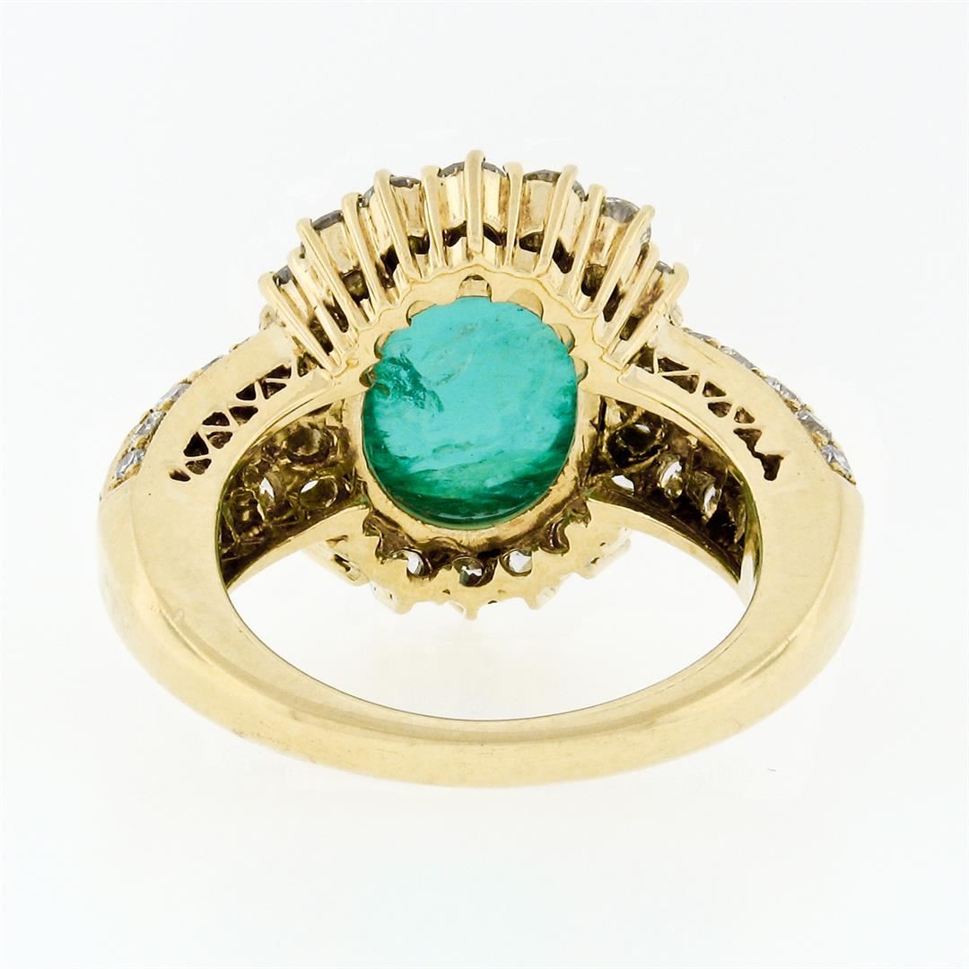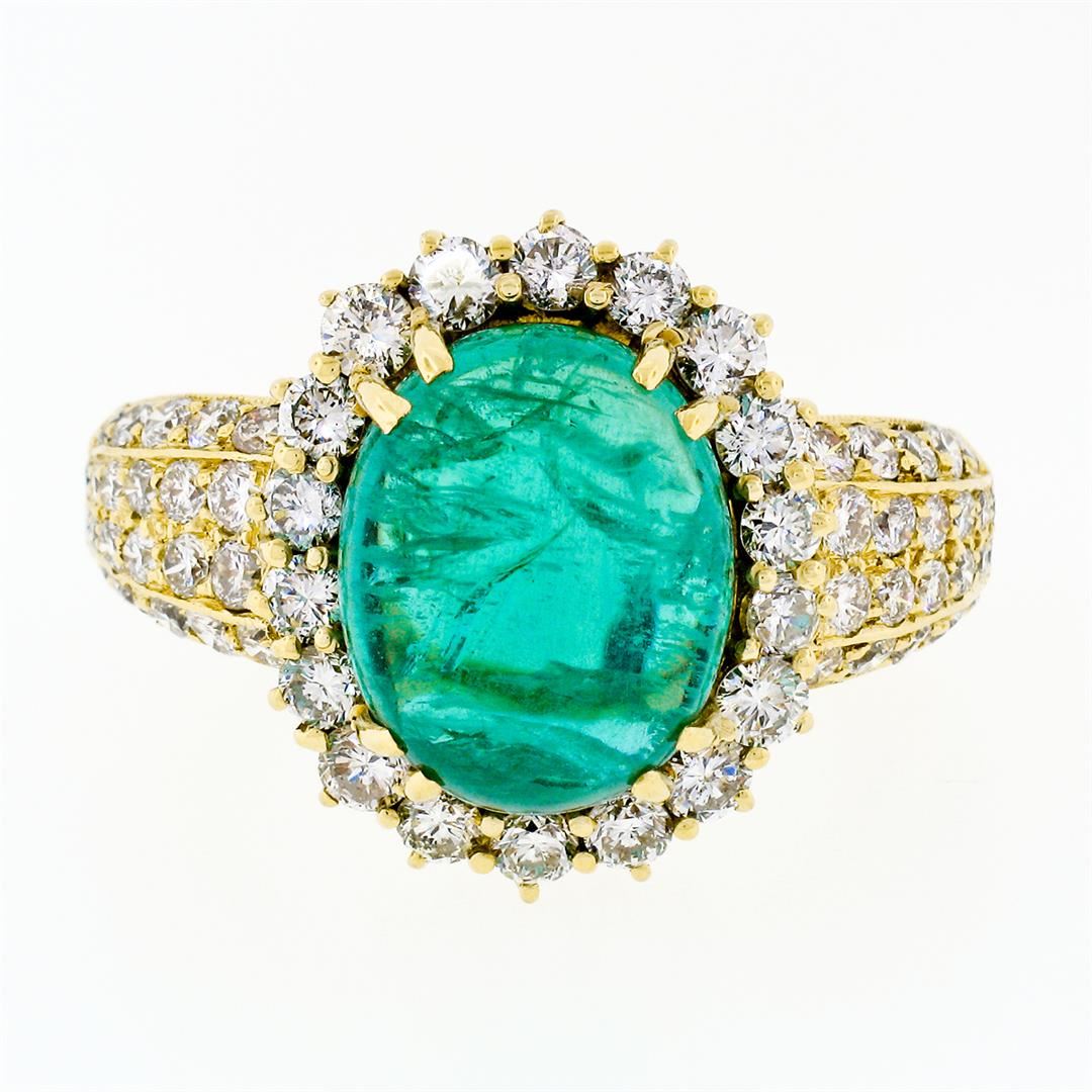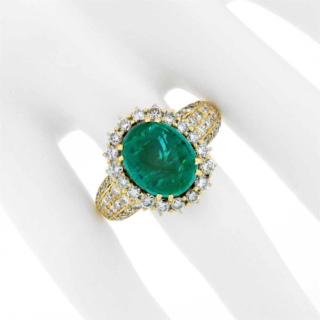 A vintage solid 18k yellow gold ring with 1 AGL certified oval cabochon cut natural emerald (13.34 x 10.82mm; 8.58ct) and 62 round brilliant cut natural diamonds (G/H - VS1/VS2; 2.50ctw). The ring is size 8.0, weighs a total of 14.43 grams, and measures 19.11mm wide. Comes with all original relevant certifications.