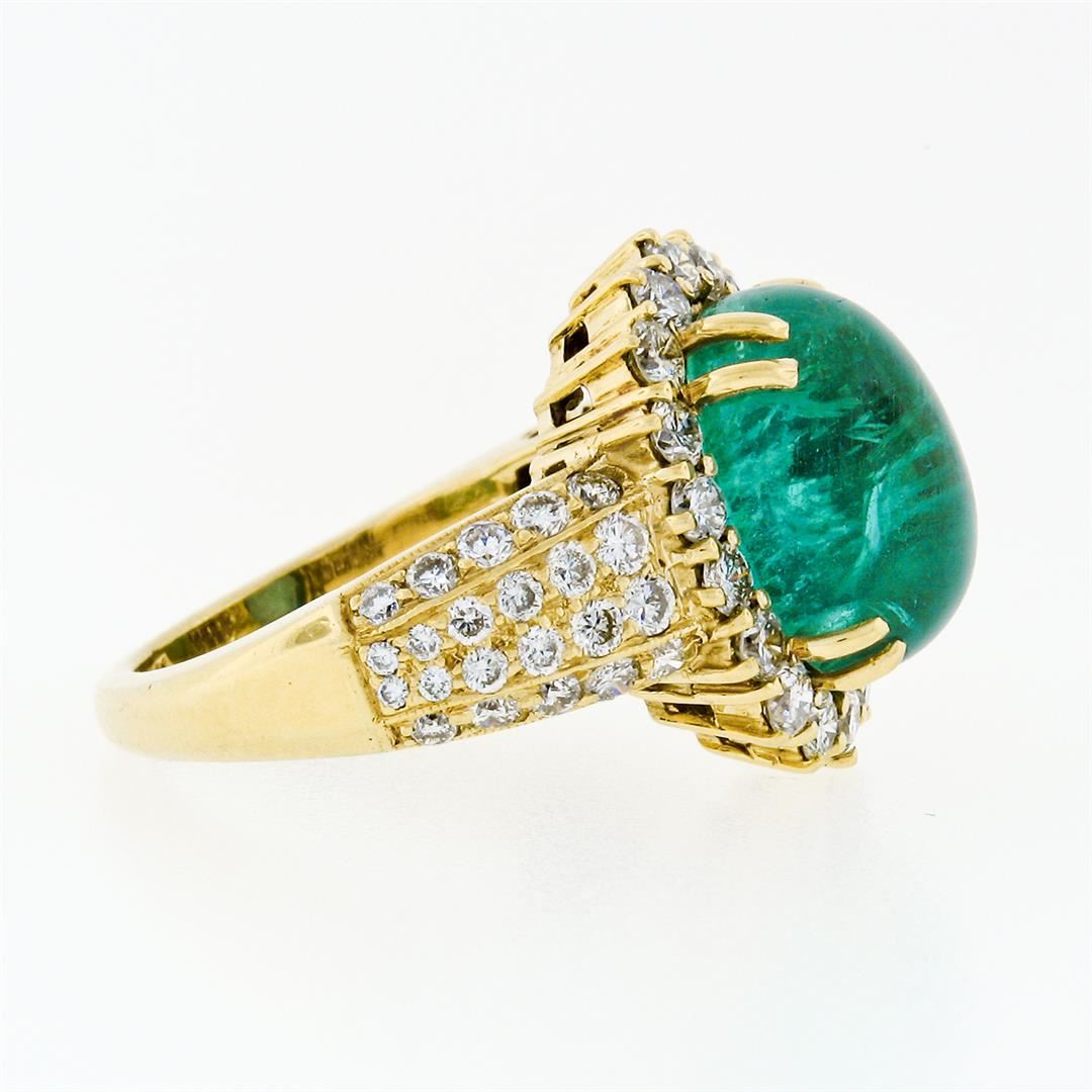A vintage solid 18k yellow gold ring with 1 AGL certified oval cabochon cut natural emerald (13.34 x 10.82mm; 8.58ct) and 62 round brilliant cut natural diamonds (G/H - VS1/VS2; 2.50ctw). The ring is size 8.0, weighs a total of 14.43 grams, and measures 19.11mm wide. Comes with all original relevant certifications.