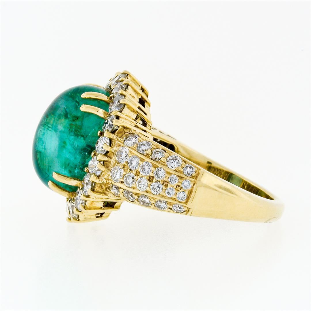 A vintage solid 18k yellow gold ring with 1 AGL certified oval cabochon cut natural emerald (13.34 x 10.82mm; 8.58ct) and 62 round brilliant cut natural diamonds (G/H - VS1/VS2; 2.50ctw). The ring is size 8.0, weighs a total of 14.43 grams, and measures 19.11mm wide. Comes with all original relevant certifications.