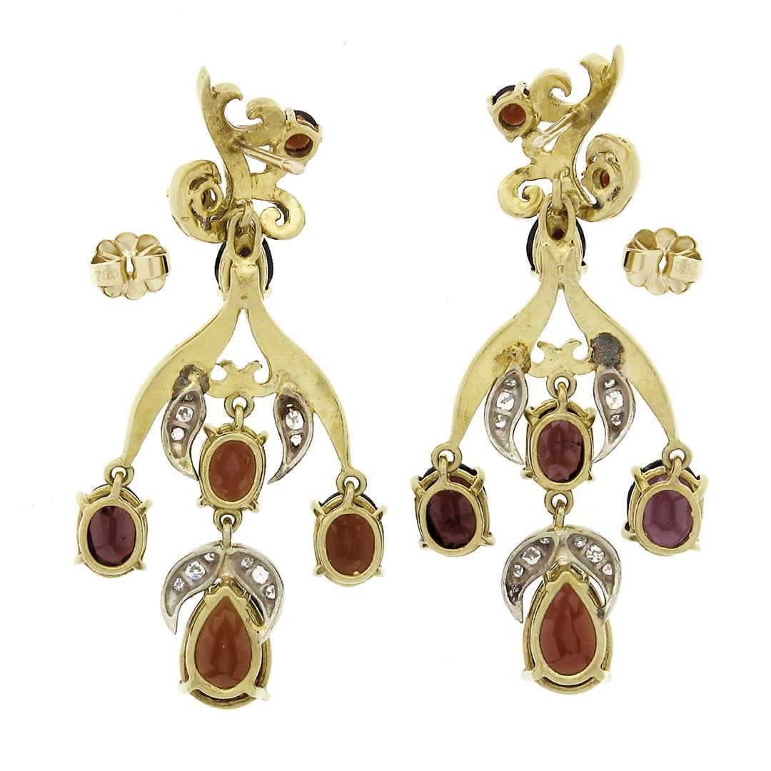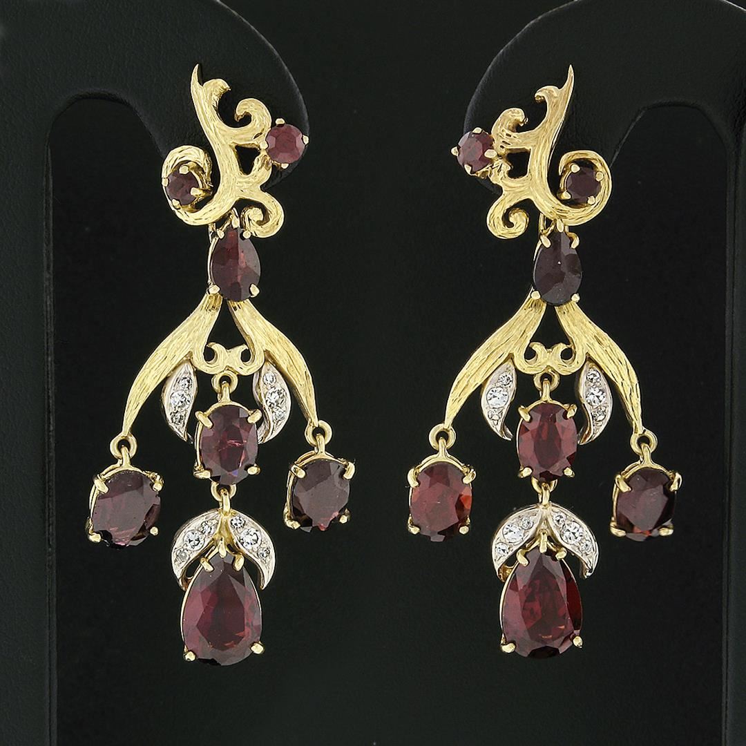 A vintage pair or solid 18k yellow gold of earrings, with 2 GIA certified pear cut natural garnets (4.17ctw), & 6 oval cut natural garnets (5.78ctw), with 2 oval rose cut natural garnets (1.26ctw), & 4 round cut natural garnets (0.52ctw ), & 12 round single with transitional cut natural diamonds (E/F - VS1/VS2 ; 0.18ctw). The earrings measure approximately 49.45x32.22mm and weigh a total of 13.81 grams.Comes with all original relevant certifications.