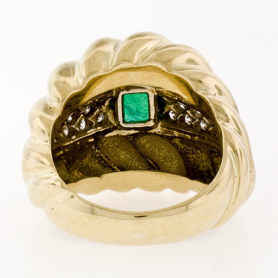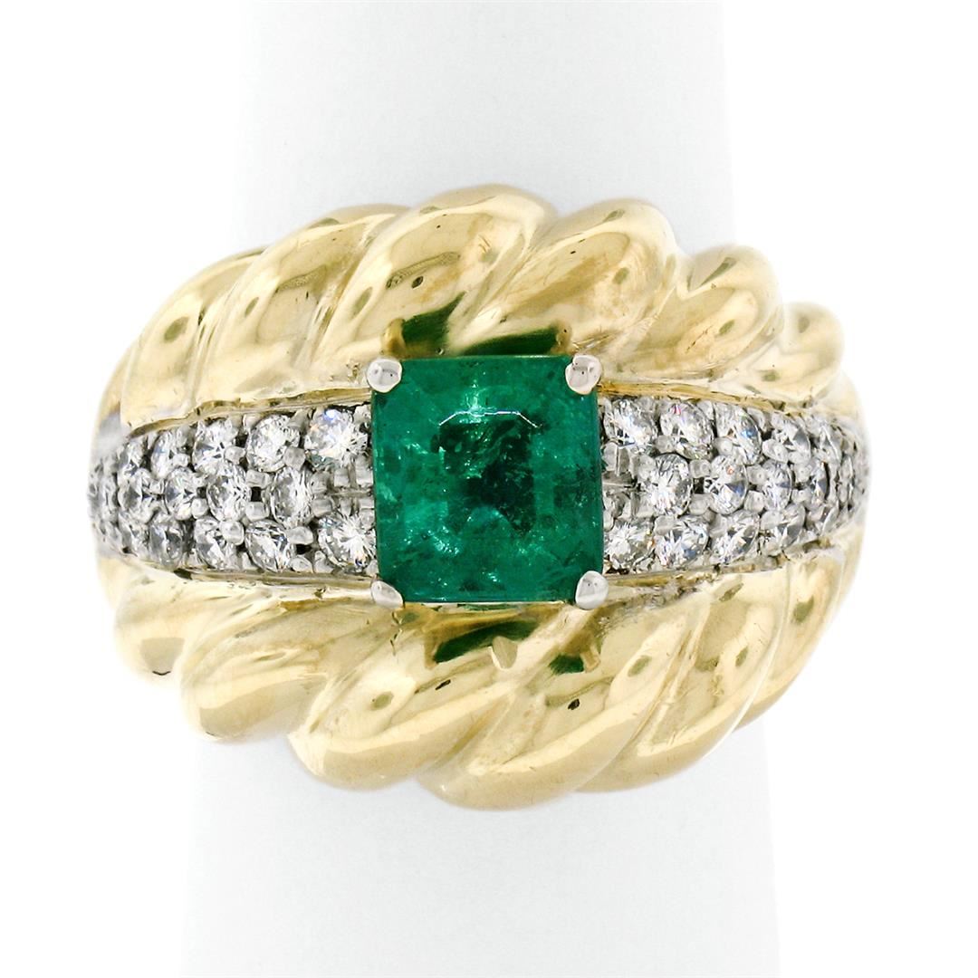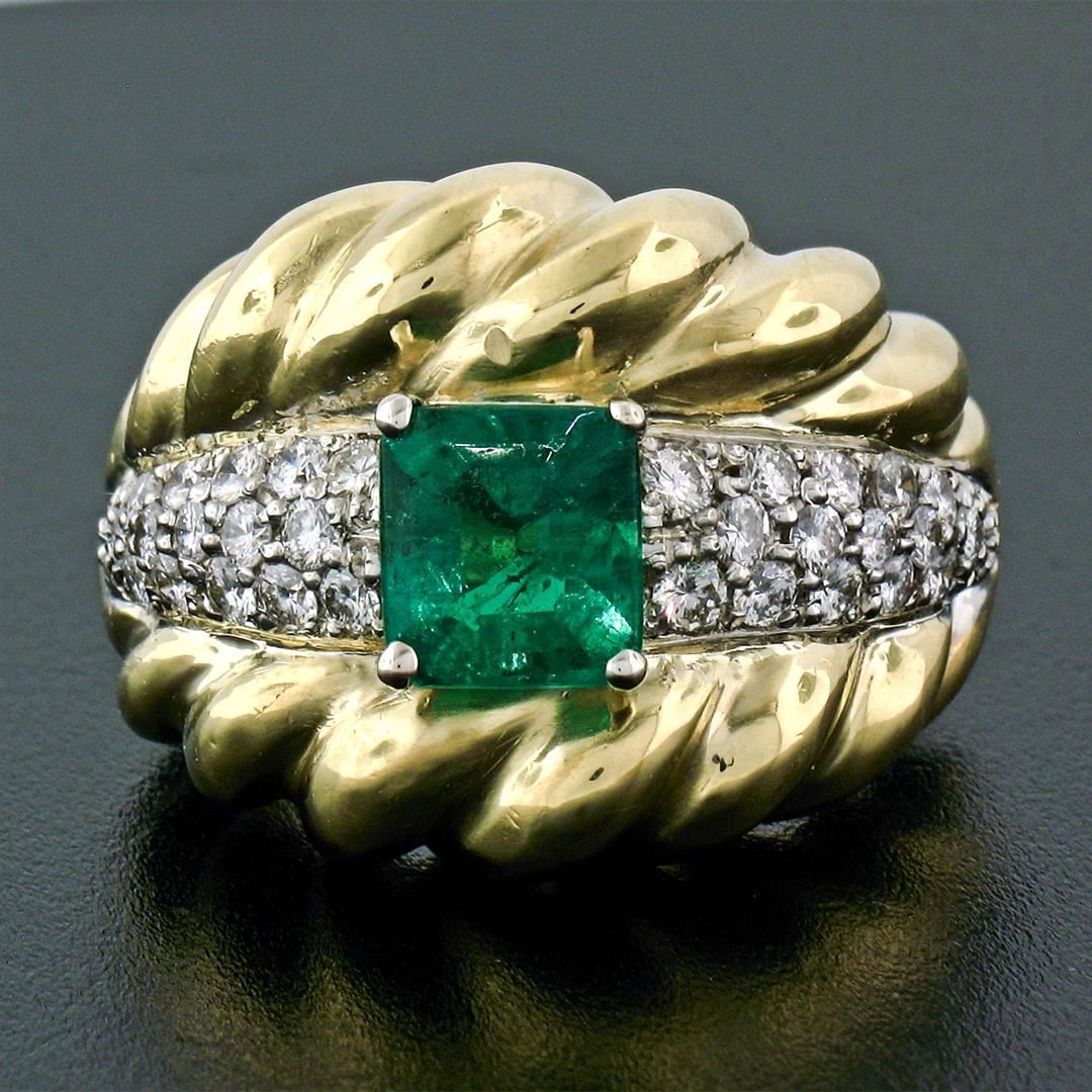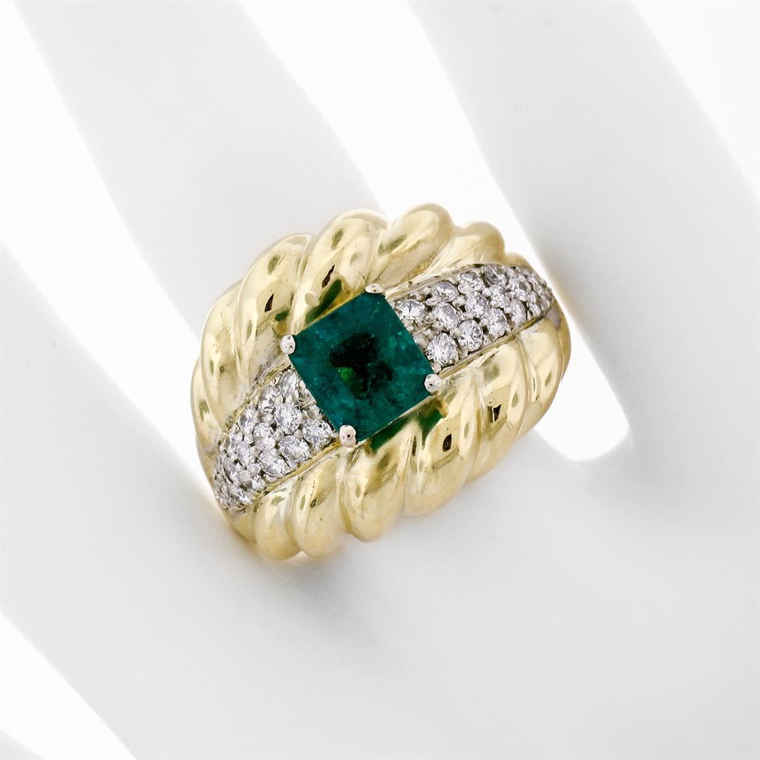 An 18k gold cocktail ring featuring a GIA certified 1.59ct Colombian emerald accented by 0.70ctw of round brilliant diamonds(F/G - VS1/VS2). The ring is size 7.0, weighs a total of 16.33 grams, and measures 18.85mm wide. Comes with original GIA certificat