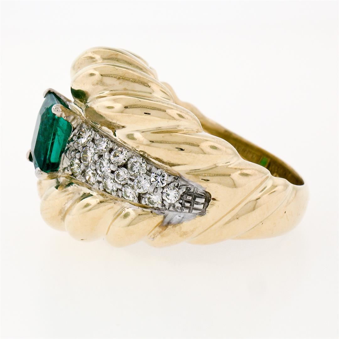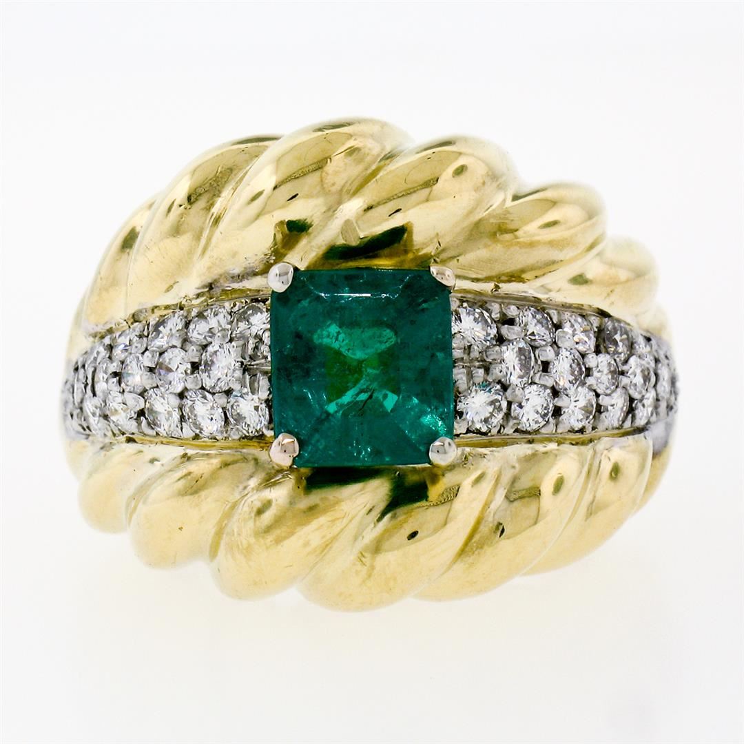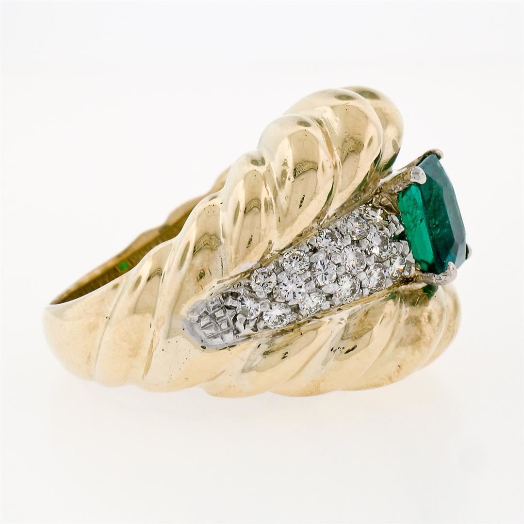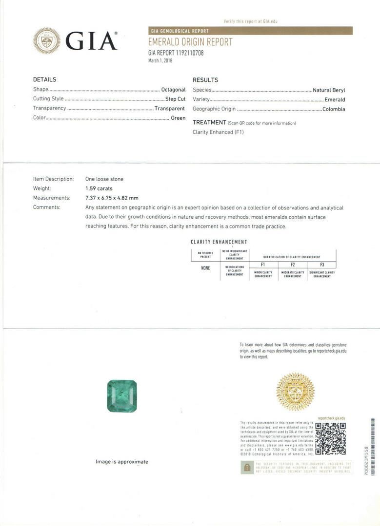 An 18k gold cocktail ring featuring a GIA certified 1.59ct Colombian emerald accented by 0.70ctw of round brilliant diamonds(F/G - VS1/VS2). The ring is size 7.0, weighs a total of 16.33 grams, and measures 18.85mm wide. Comes with original GIA certification for the emerald.