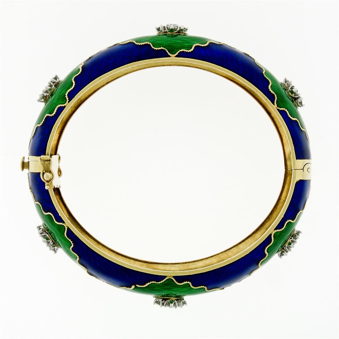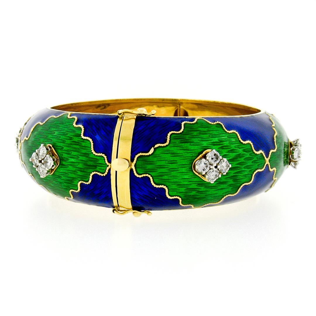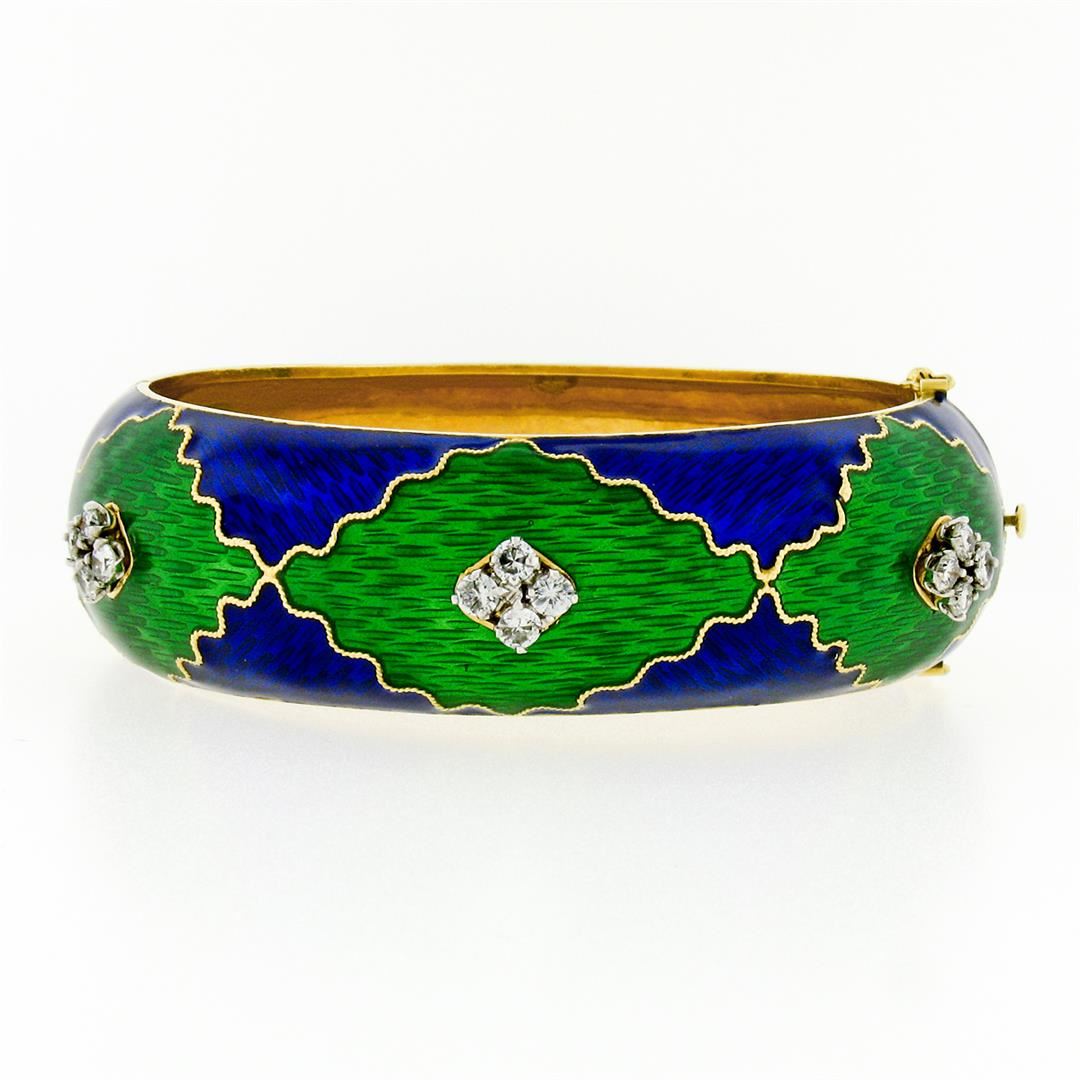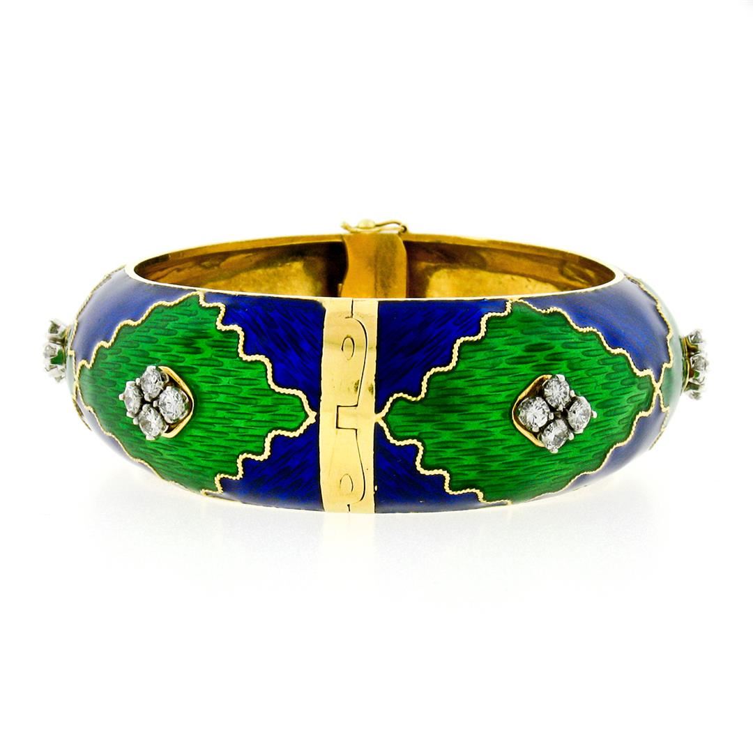 A vintage solid 18k yellow gold bangle bracelet, with blue & green enamel work, with 24 round brilliant cut natural diamonds (F/G - VVS2/VS1; 2.64ctw). It weighs a total of 70.59 grams, measures 21mm wide, and measures 7 inches in length.