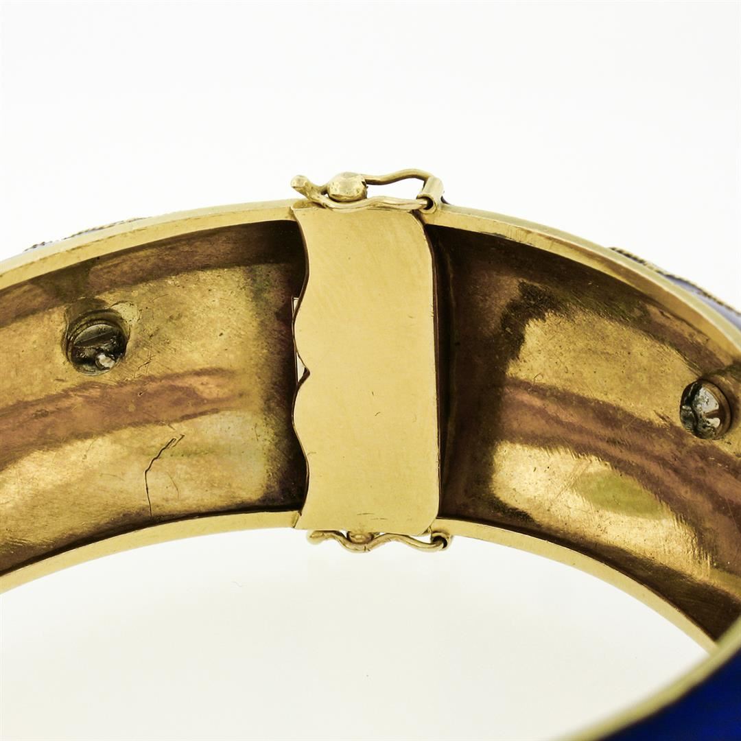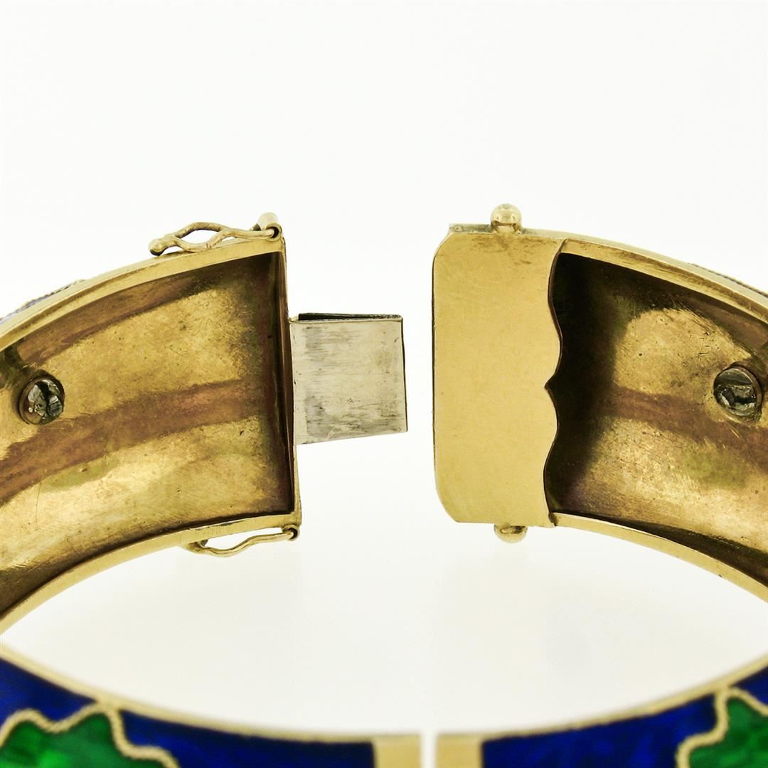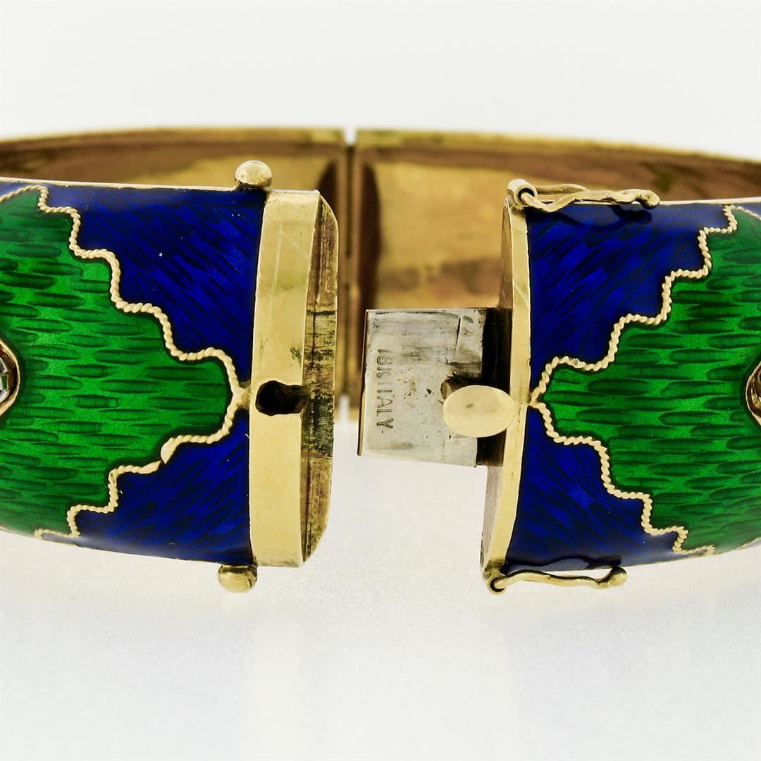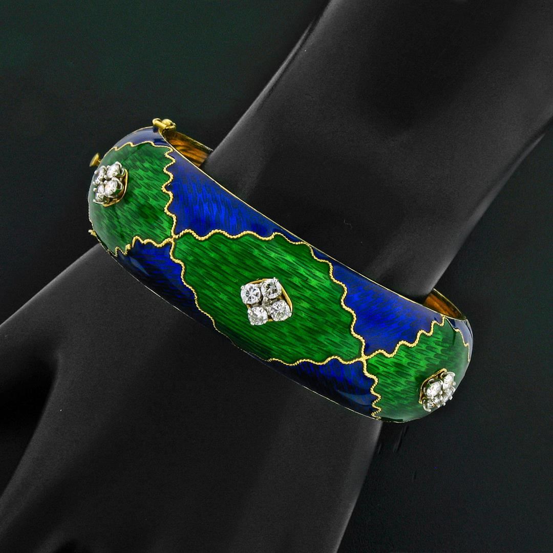A vintage solid 18k yellow gold bangle bracelet, with blue & green enamel work, with 24 round brilliant cut natural diamonds (F/G - VVS2/VS1; 2.64ctw). It weighs a total of 70.59 grams, measures 21mm wide, and measures 7 inches in length.