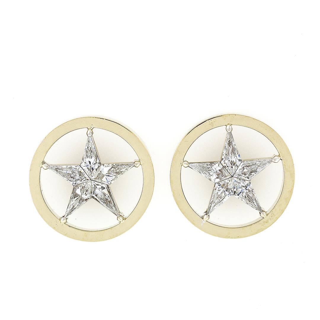 A vinatge solid 18k yellow & white gold star stud earrings, with 10 custom kite shaped natural diamonds (E/F - VVS2/VS1 ; 6.6X3.5mm - 2.75ctw). The earrings measure approximately 17.5mm in diameter and weigh a total of 11.28 grams.