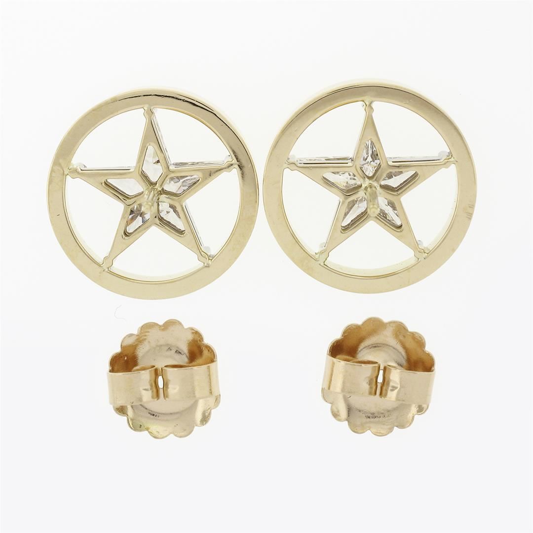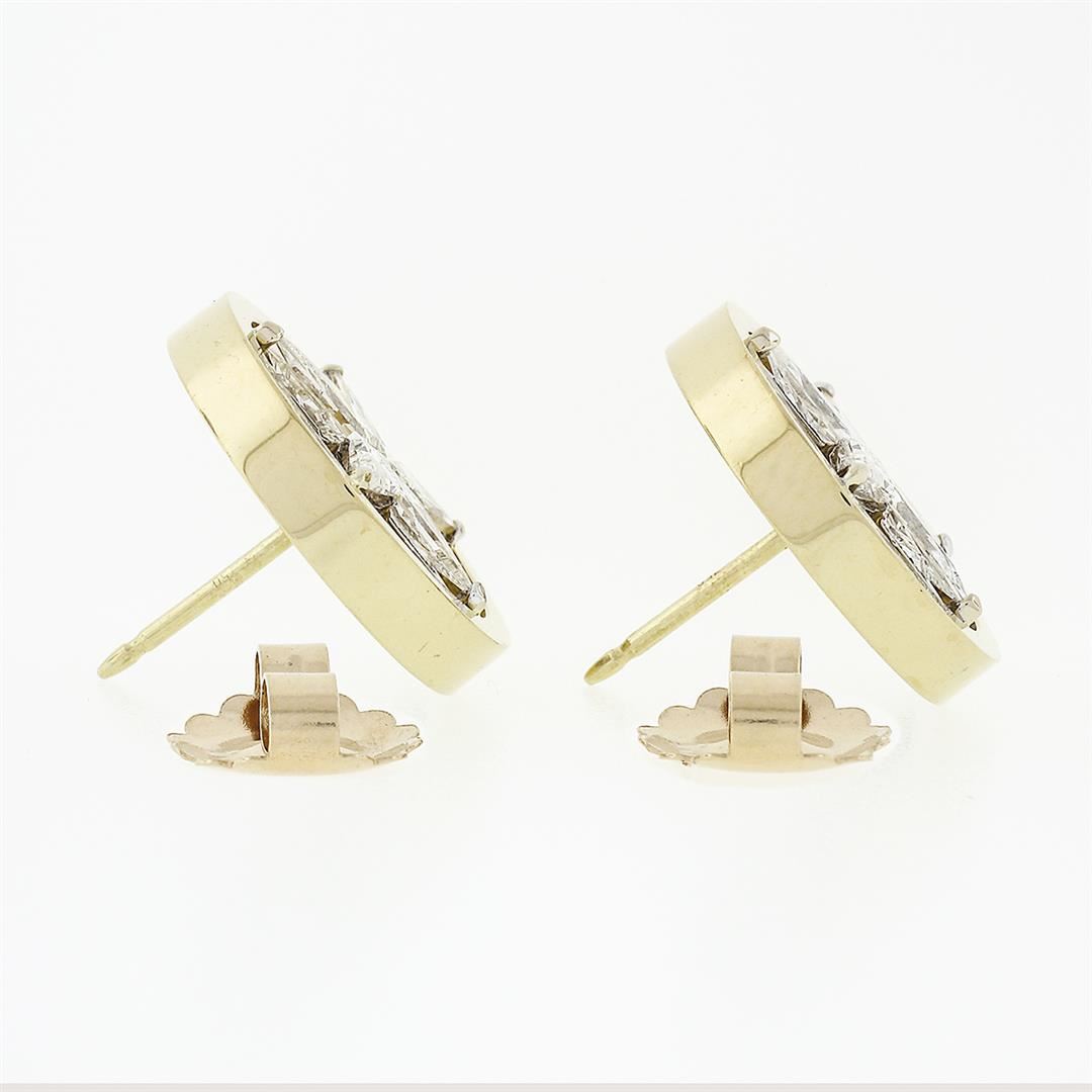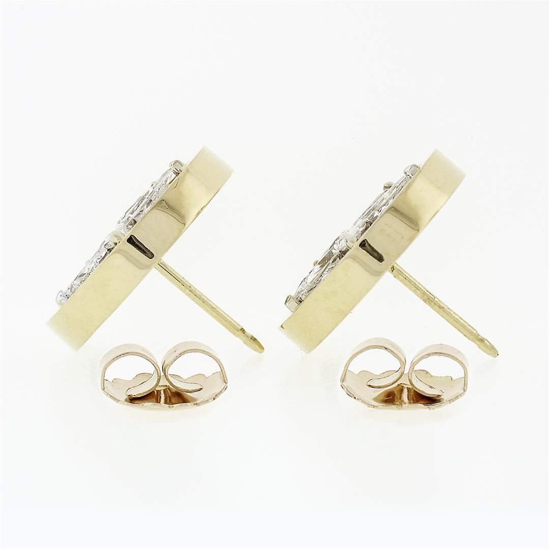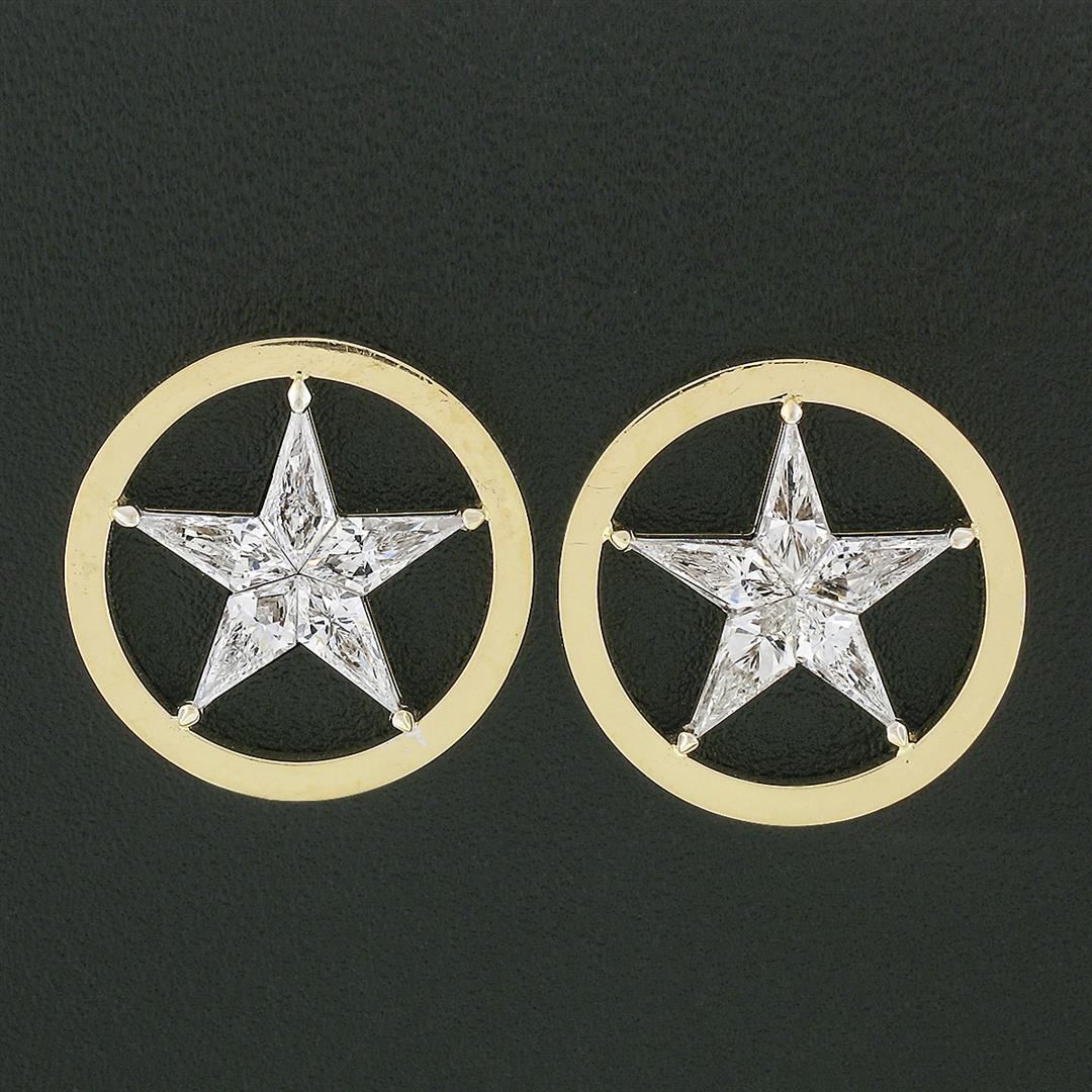 A vinatge solid 18k yellow & white gold star stud earrings, with 10 custom kite shaped natural diamonds (E/F - VVS2/VS1 ; 6.6X3.5mm - 2.75ctw). The earrings measure approximately 17.5mm in diameter and weigh a total of 11.28 grams.
