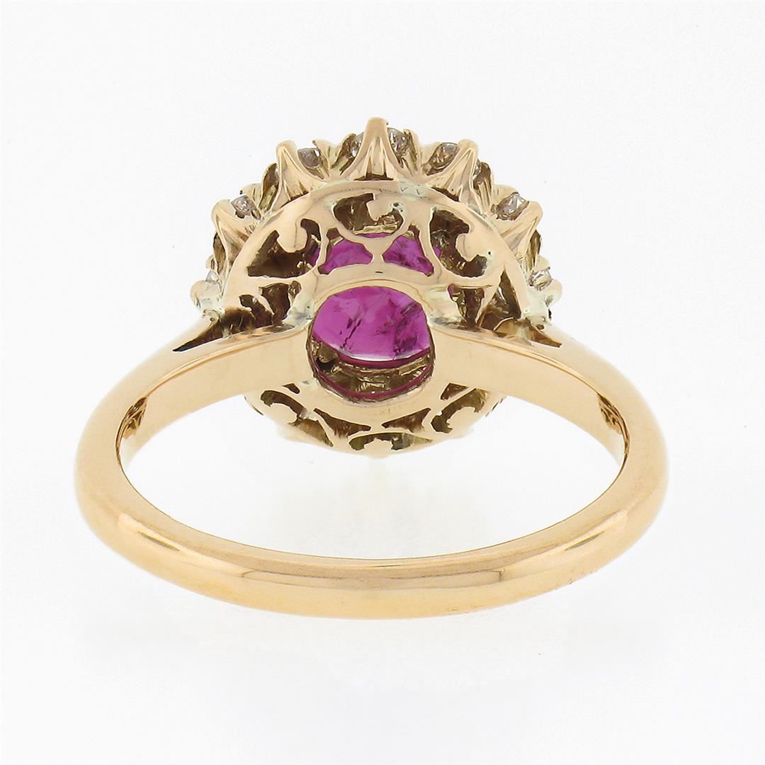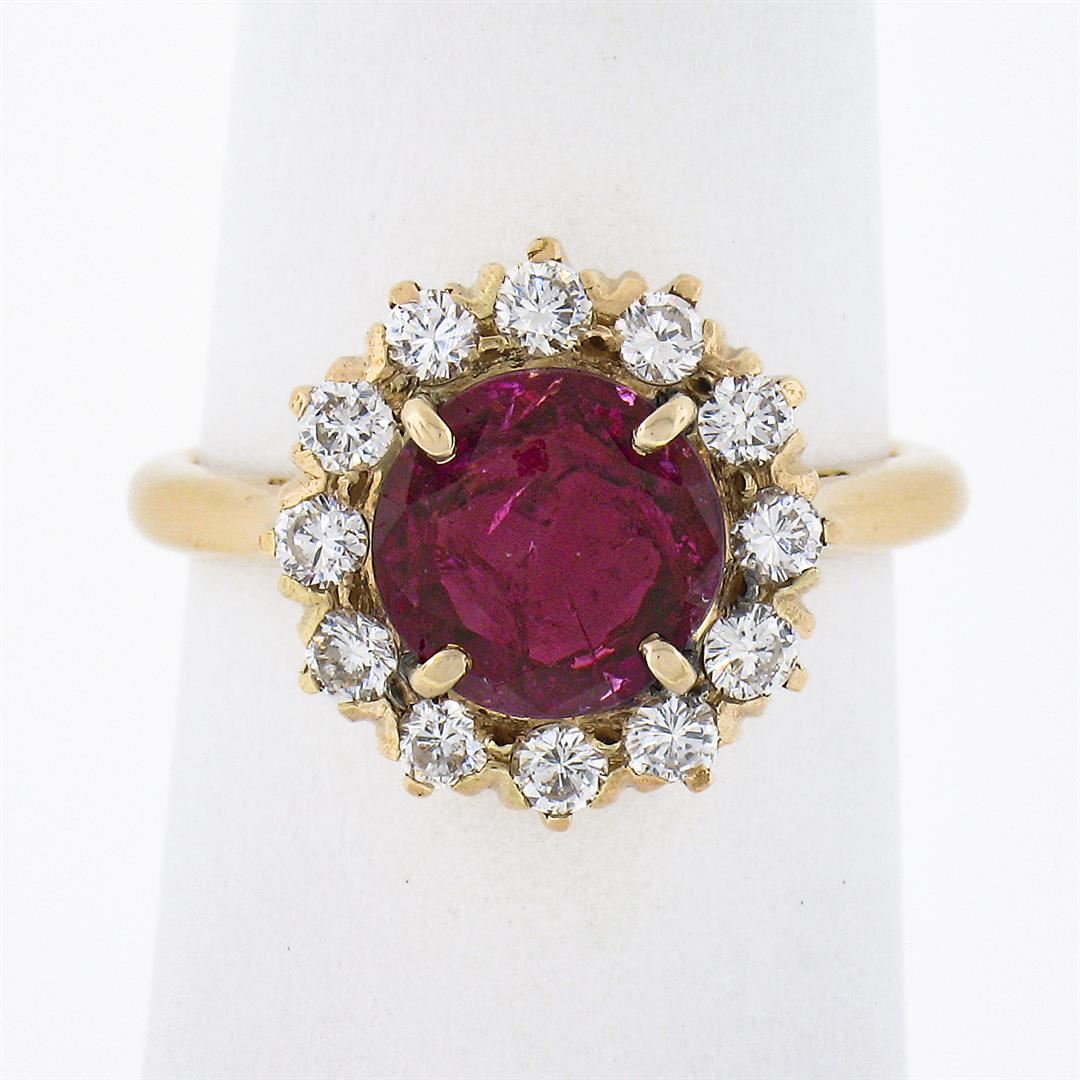 A vintage solid 18k yellow gold cluster ring, with 1 Gia certified round cut natural ruby (1.50ct), surrounded with a halo of 12 round brilliant cut natural diamonds (G/H - VS1/VS2 ; 0.50ctw). The ring is size 6.0, weighs a total of 4.80 grams, and measures 13.20mm wide. Comes with all original relevant certifications.