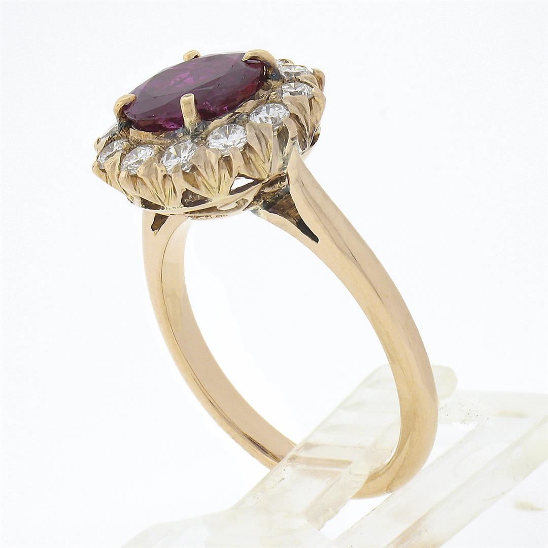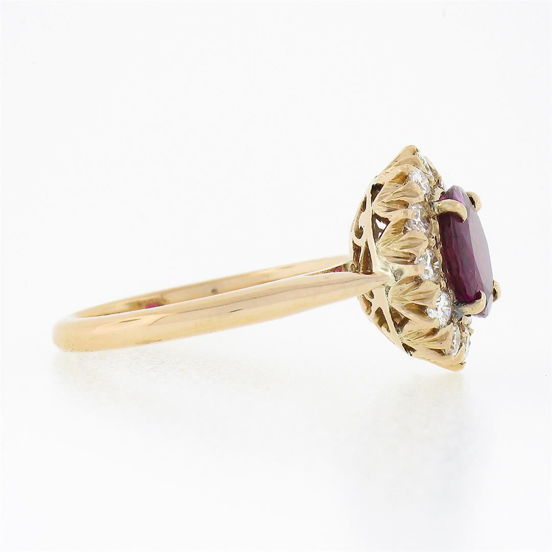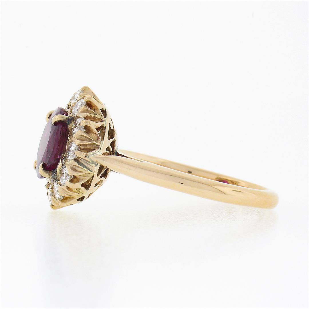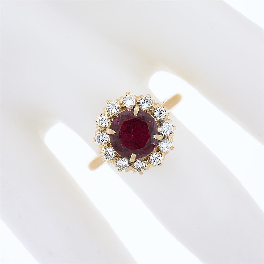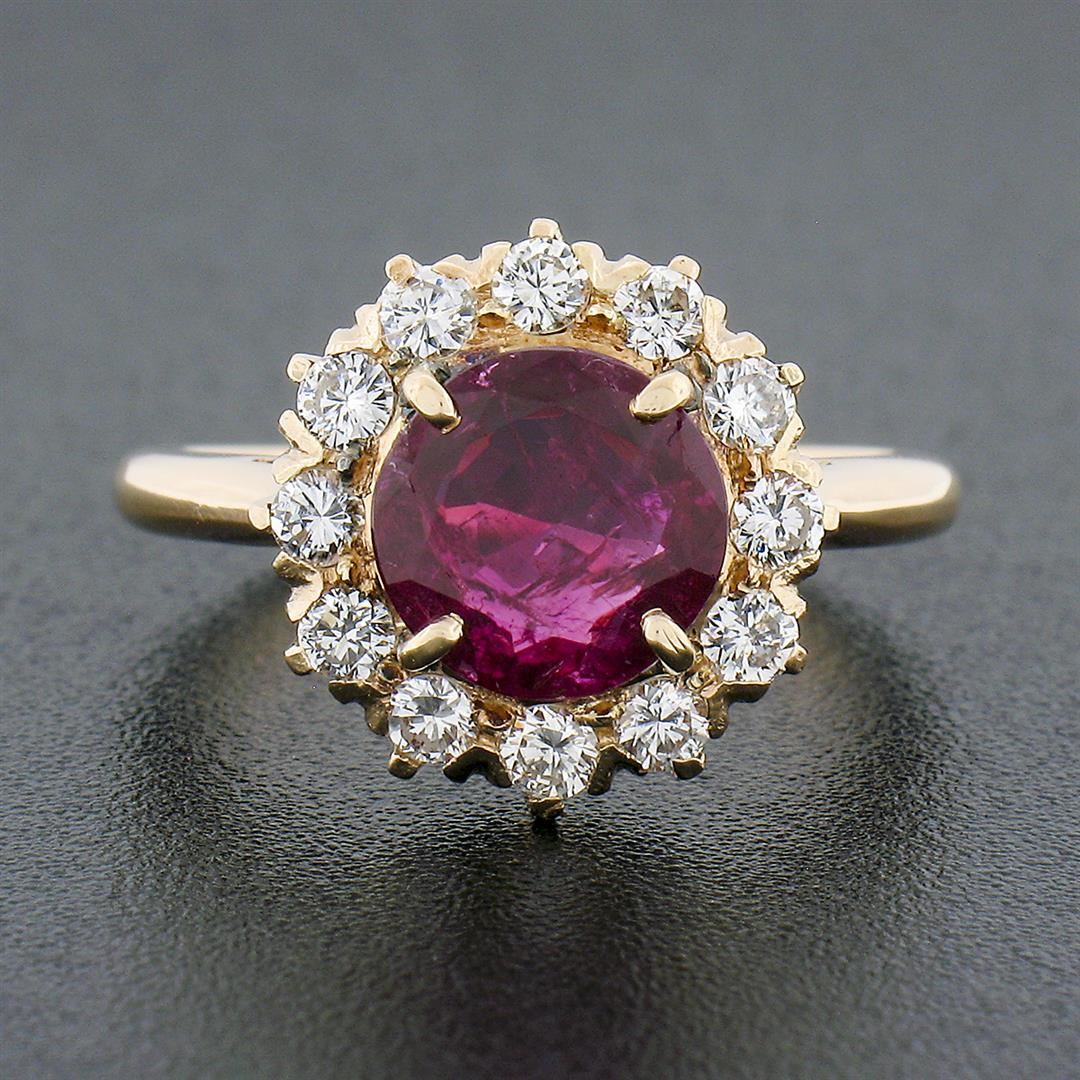 A vintage solid 18k yellow gold cluster ring, with 1 Gia certified round cut natural ruby (1.50ct), surrounded with a halo of 12 round brilliant cut natural diamonds (G/H - VS1/VS2 ; 0.50ctw). The ring is size 6.0, weighs a total of 4.80 grams, and measures 13.20mm wide. Comes with all original relevant certifications.