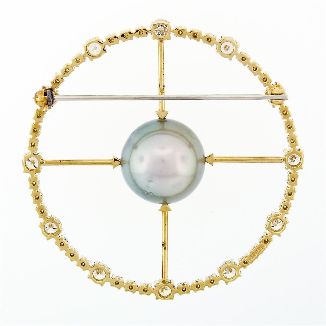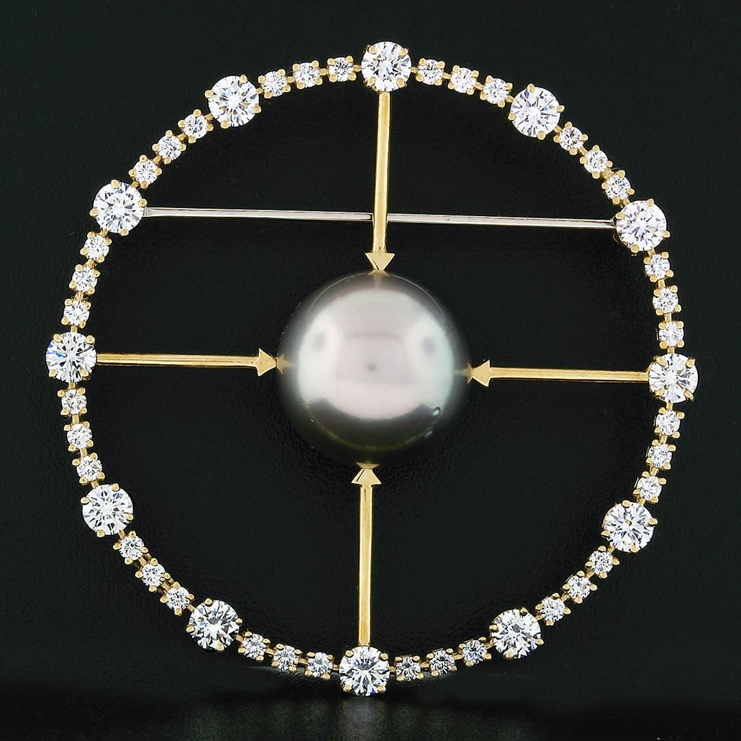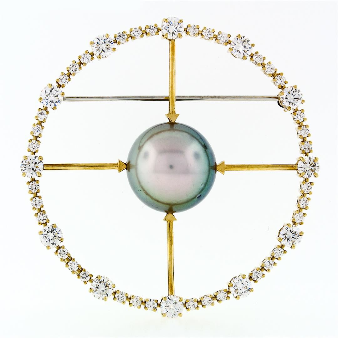 A vintage solid 18k yellow gold wreath circle pin brooch, with 1 round bead cut tahitian pearl (14.3mm), and 48 round brilliant cut natural diamonds (G/H - VVS2/VS1; 3.06ctw). Measures 47.5mm in diameter and weighs a total of 12.15 grams.