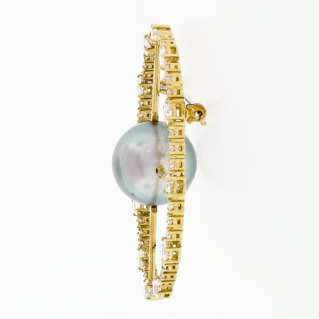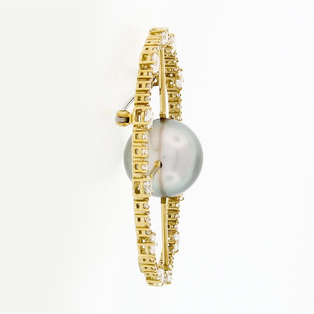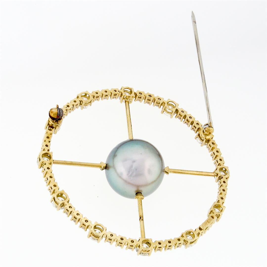 A vintage solid 18k yellow gold wreath circle pin brooch, with 1 round bead cut tahitian pearl (14.3mm), and 48 round brilliant cut natural diamonds (G/H - VVS2/VS1; 3.06ctw). Measures 47.5mm in diameter and weighs a total of 12.15 grams.